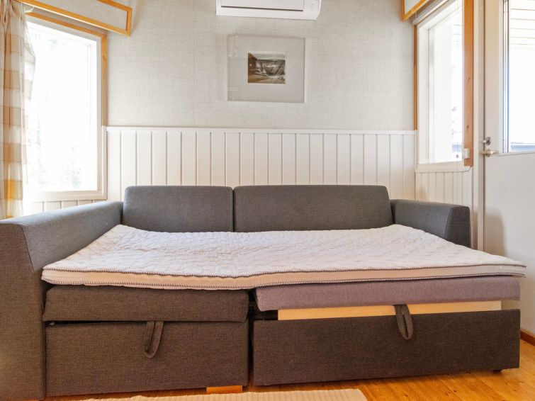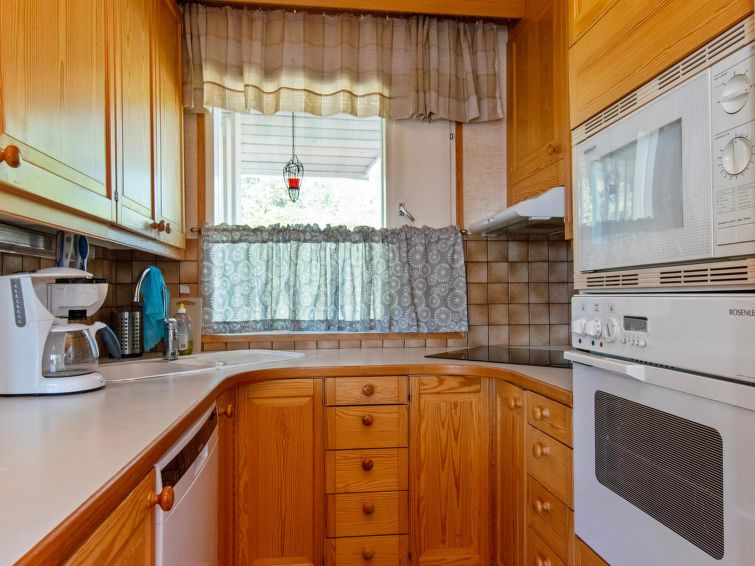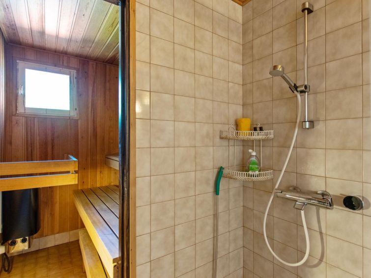 The 75 square meter apartment has a kitchen/living room, a bedroom, 2 alcoves, a washroom/toilet, a sauna, a toilet and a terrace. In addition, a small outdoor storage.