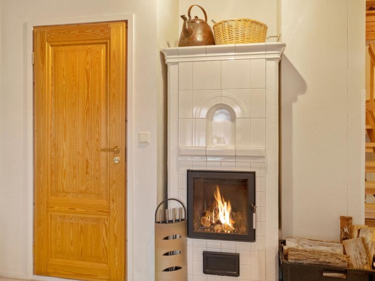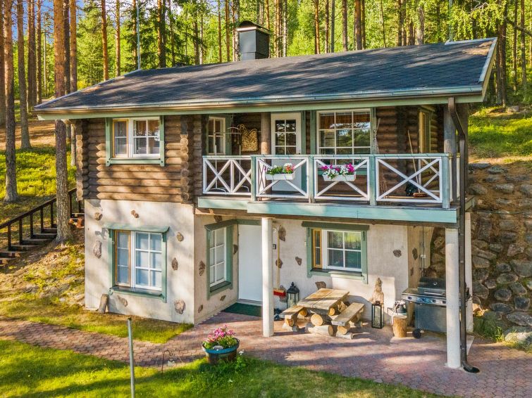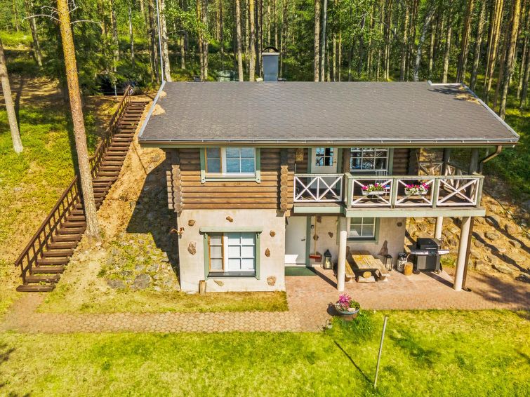 Log cabin (stone-built ground floor) on two floors, built in 2005. On the upper floor, living room with sofa bed, kitchen, bedroom (folding door) with 1 bed (width 140 cm), covered porch. On the ground floor, sauna (electric sauna stove), washroom/WC, living room with fireplace, bedroom (folding door) with double bed (width 140 cm). 2 televisions. In addition, PlayStation 2 console with some games, gas grill, and mosquito trap (so-called mosquito magnet). Water to the cabin comes from the spring.