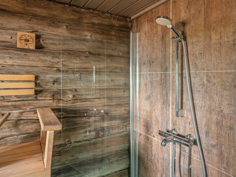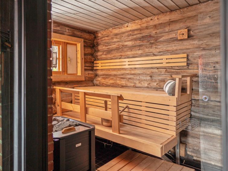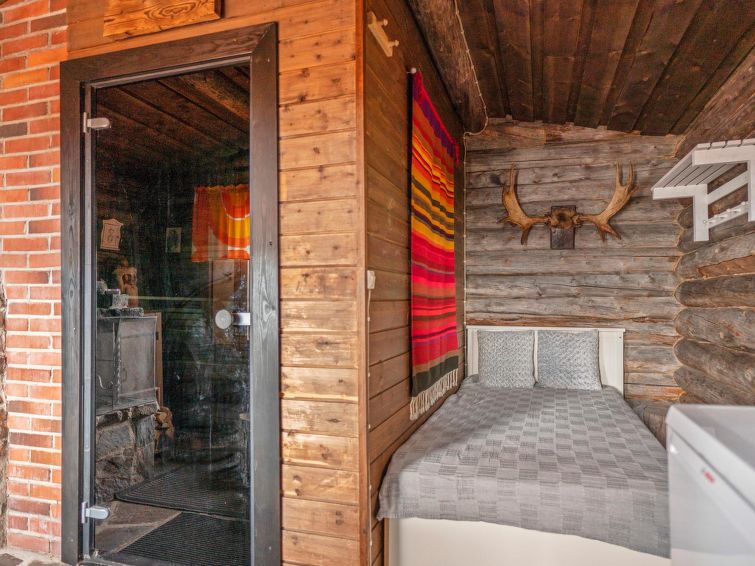 Lakeside sauna with steam room and fireplace room. 1 bed in the fireplace room. Lakeside sauna is renovated in 2020. The sauna has a shower in the steam room, electric light and electric heating. In the fireplace room, there are electric hot plates and a refrigerator.