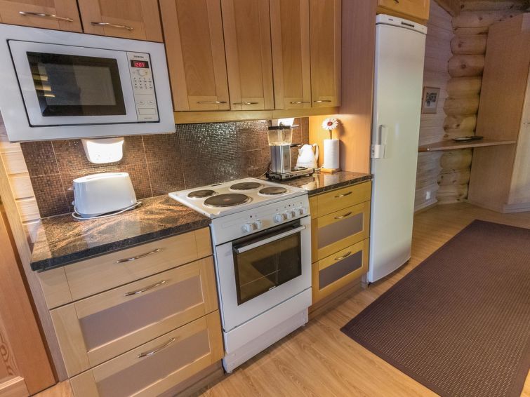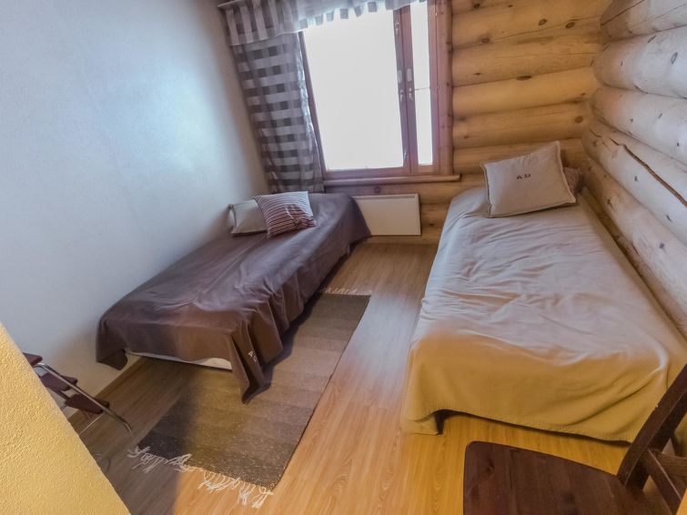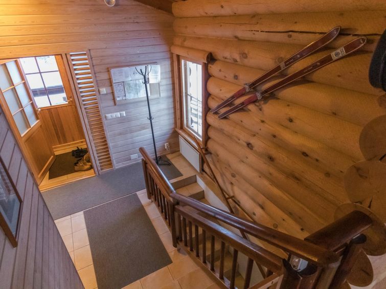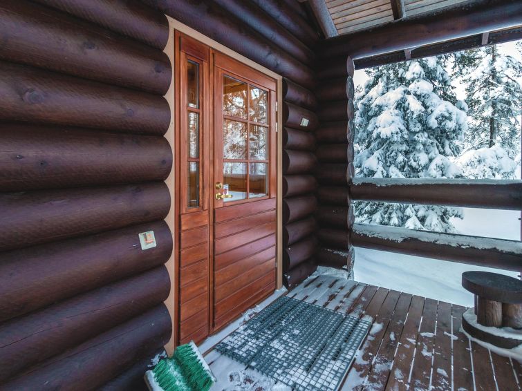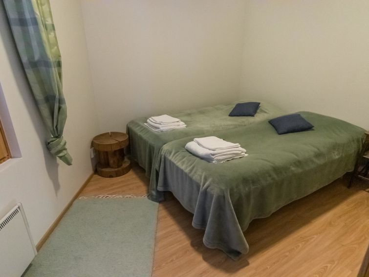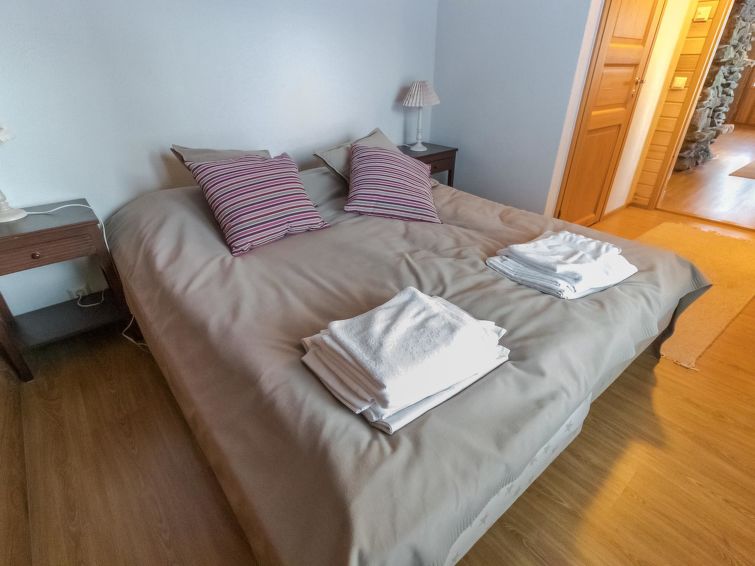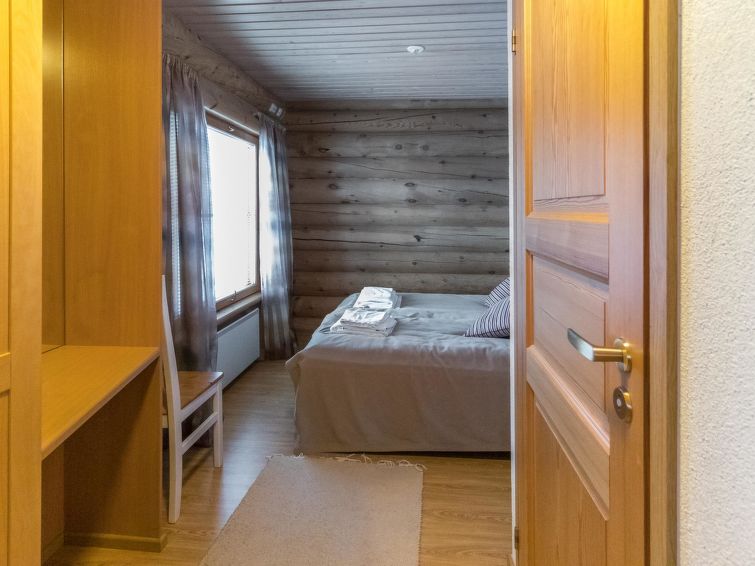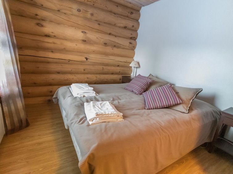 A two-storey log house, built in 2004. Upstairs living room, dining room, kitchen (no door), upstairs bedroom with double bed, second bedroom with 2 single beds. Downstairs bedroom (2 single beds), a spacious sauna (electric stove), washroom (2 showers), toilet, sauna's dressing room and storage room.