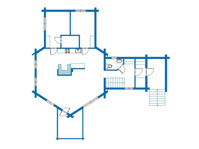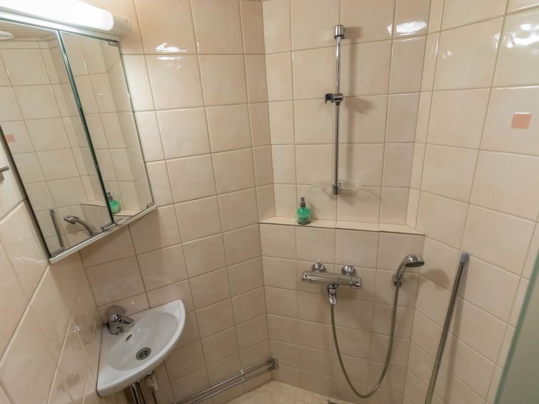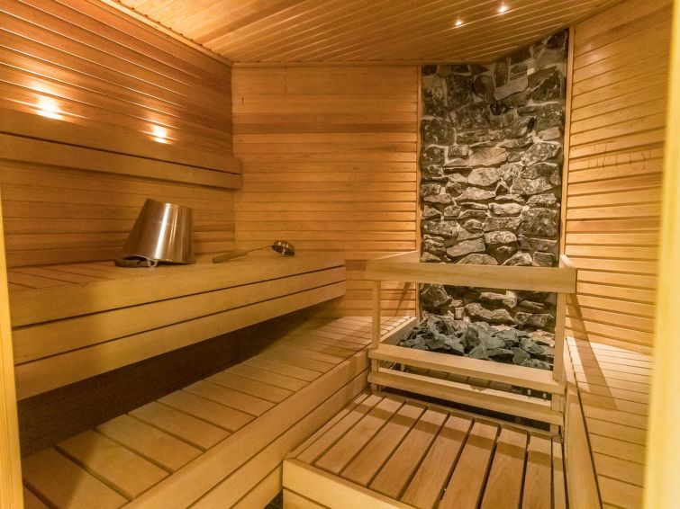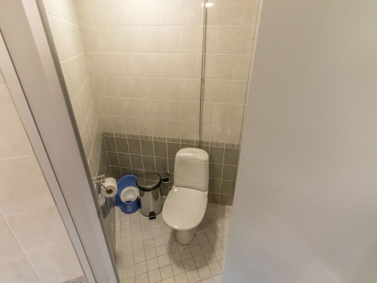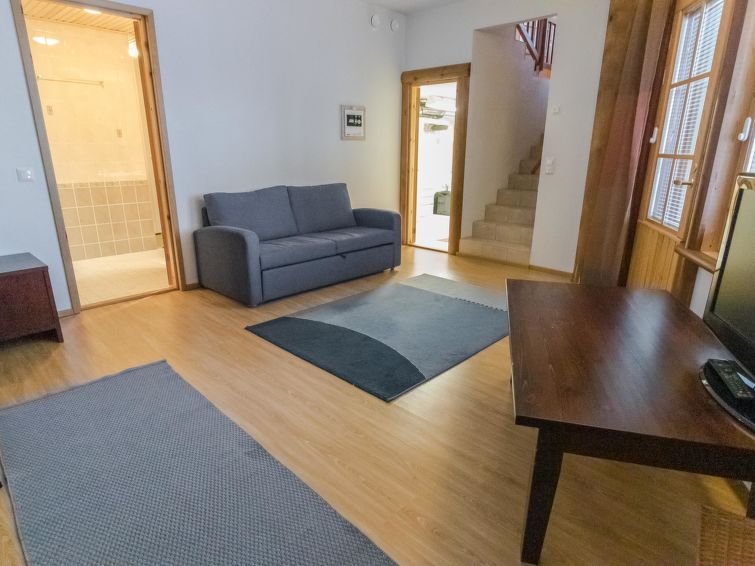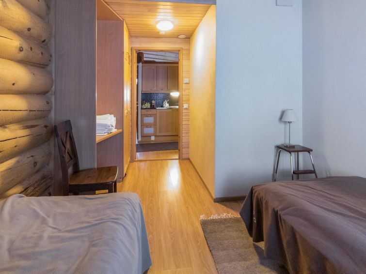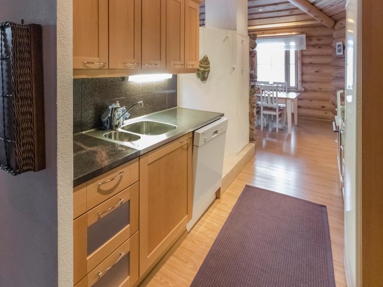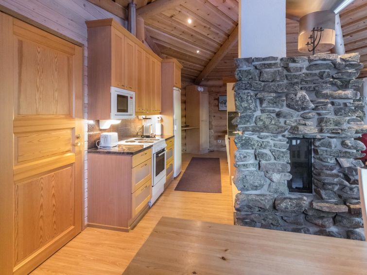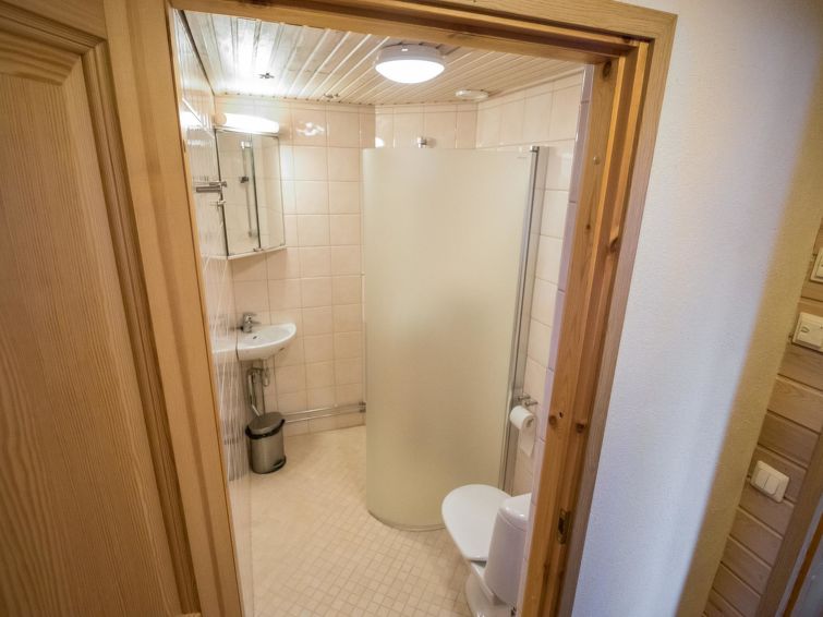 A two-storey log house, built in 2004. Upstairs living room, dining room, kitchen (no door), upstairs bedroom with double bed, second bedroom with 2 single beds. Downstairs bedroom (2 single beds), a spacious sauna (electric stove), washroom (2 showers), toilet, sauna's dressing room and storage room.