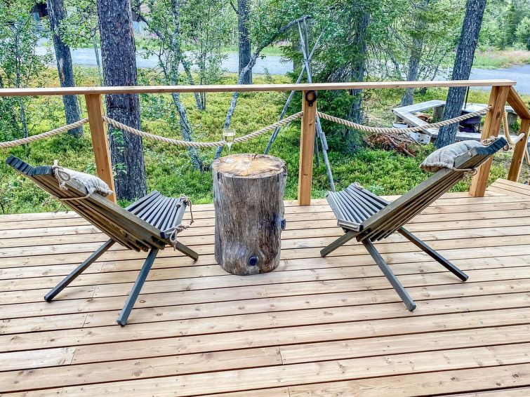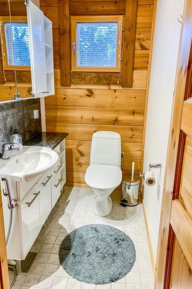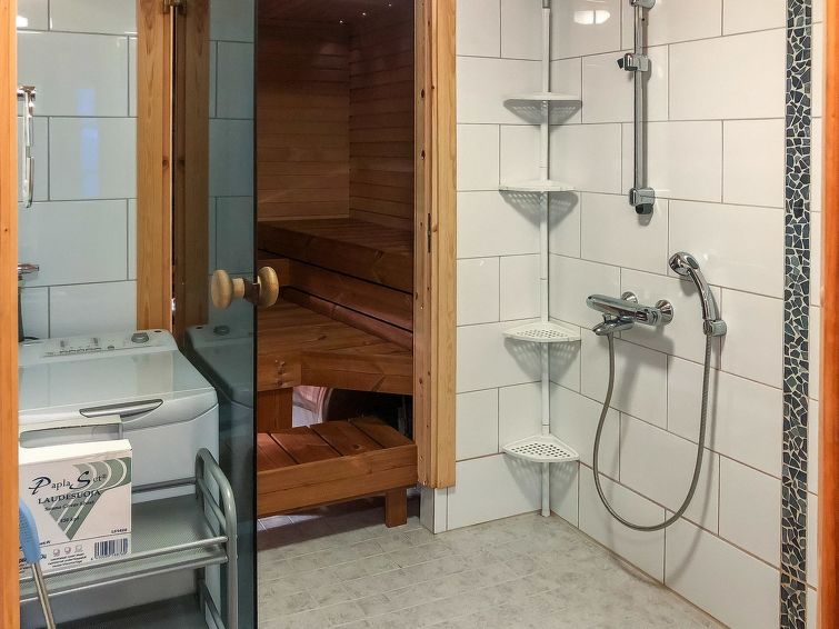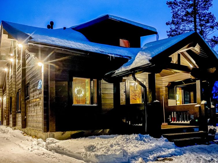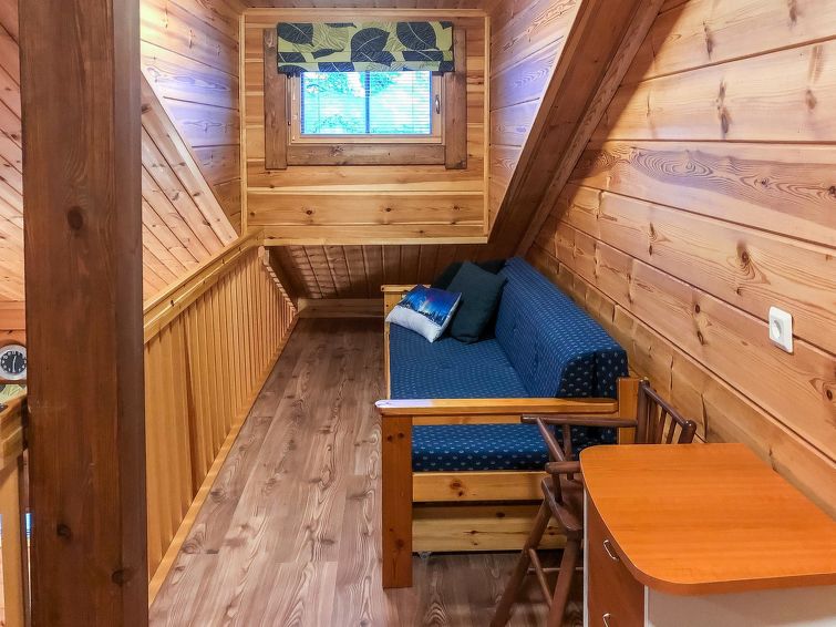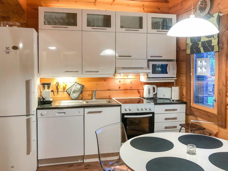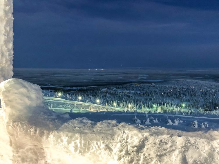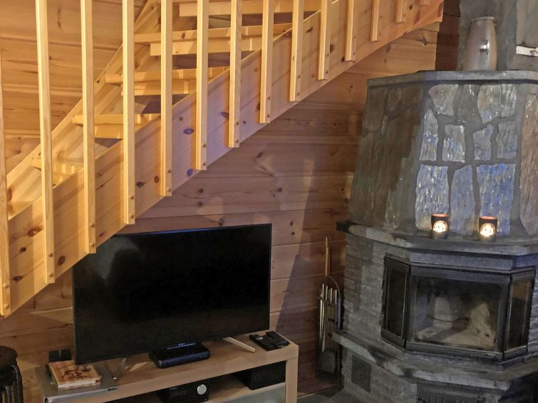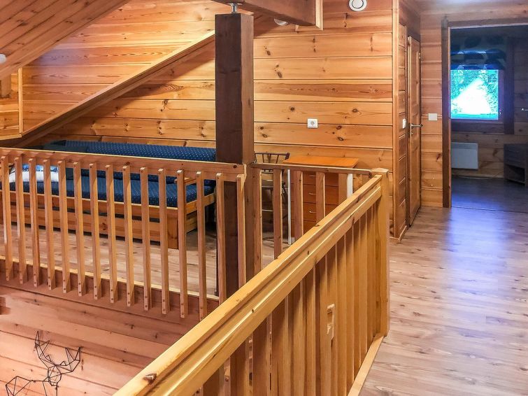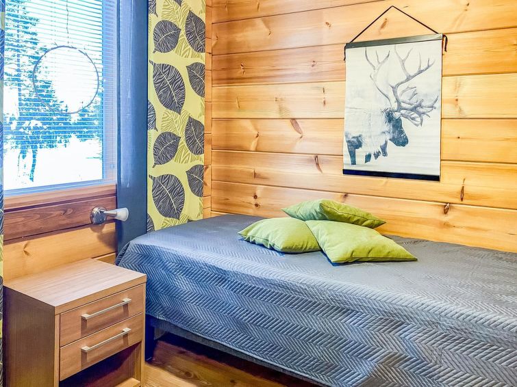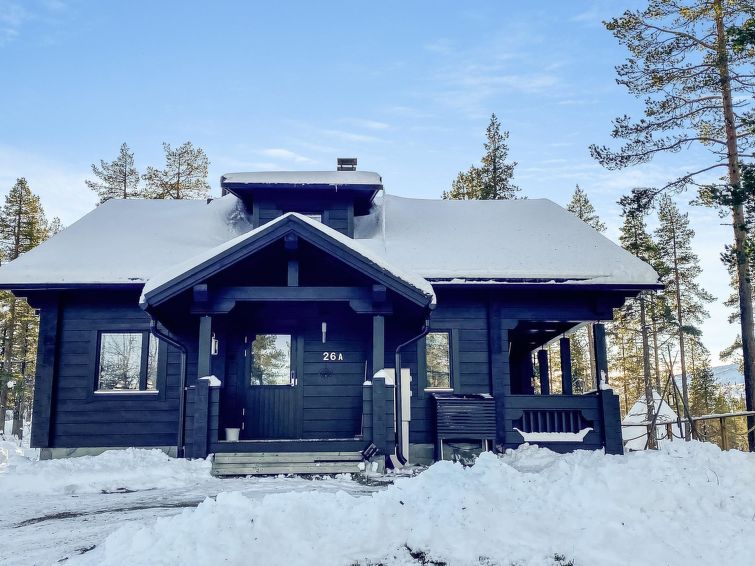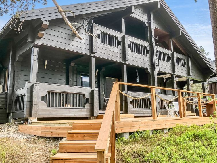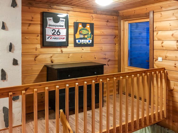 Half of (= apartment in) semi-detached log unit, panelled interior, 2008, living room/kitchen, bedroom double bed, bedroom 1 bed, sauna (electric stove), washroom (2 showers). Upstairs: sofa bed for 1-2 persons, sleeping alcove 2 beds, WC also upstairs, balcony, open porch. Holiday apartment on slope of Levitunturi in Utsuvaara area. Spectacular views towards Levitunturi and the surrounding scenery.