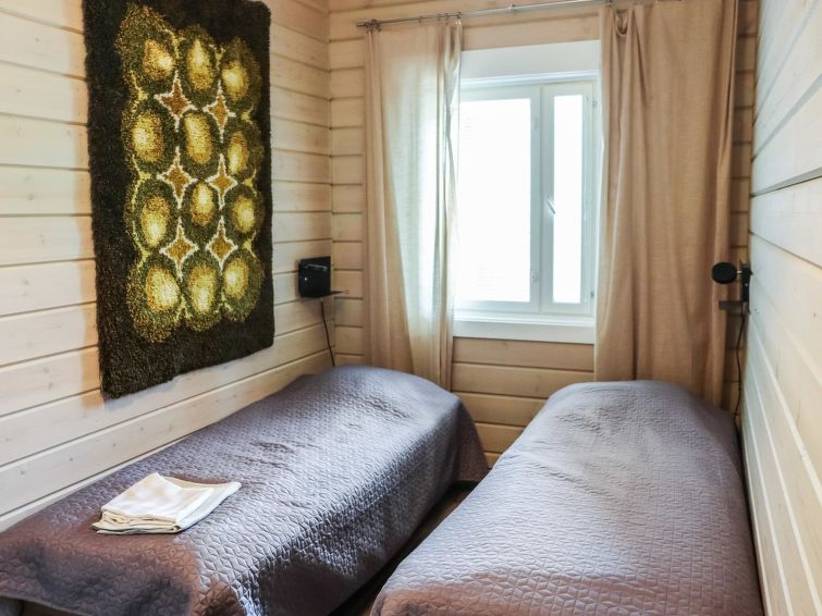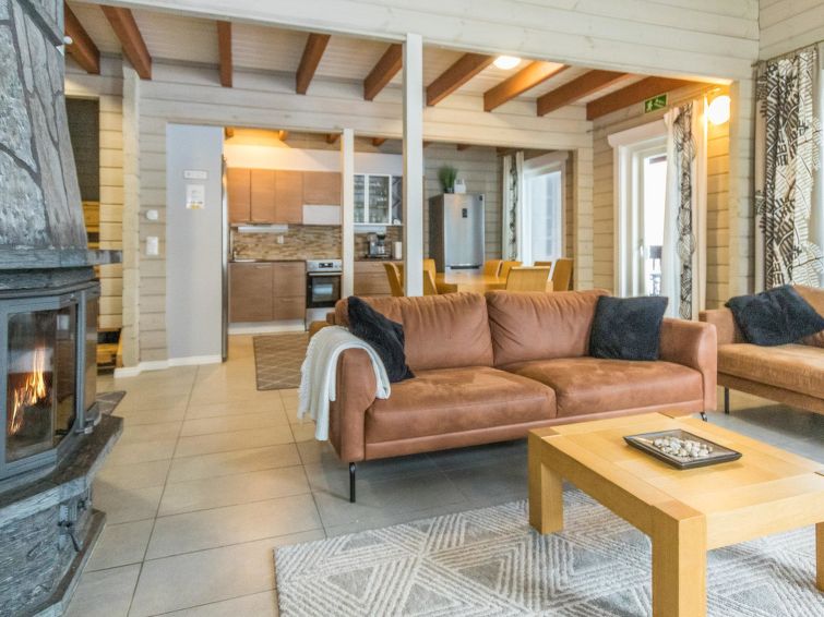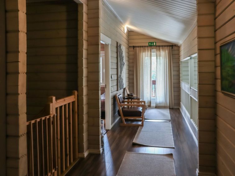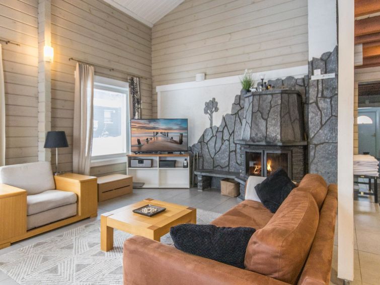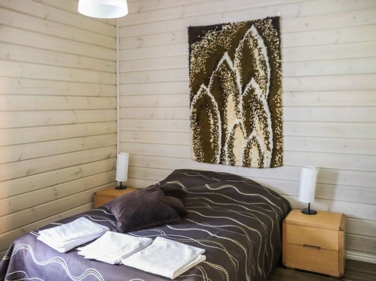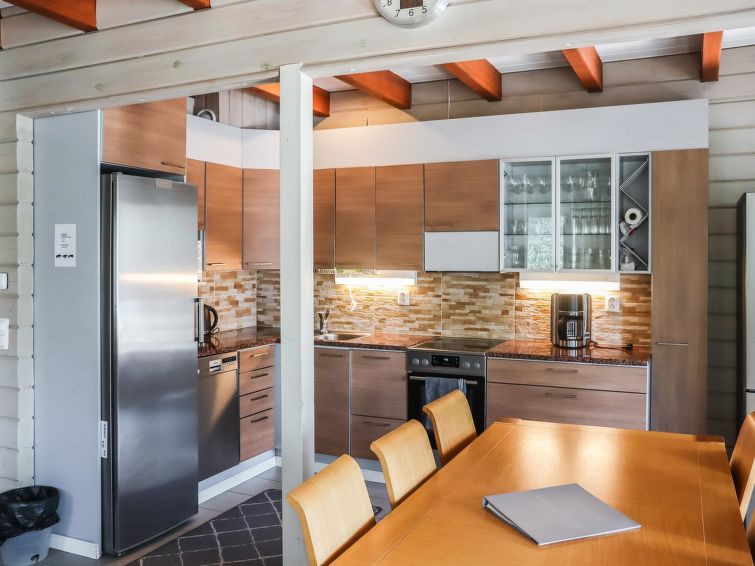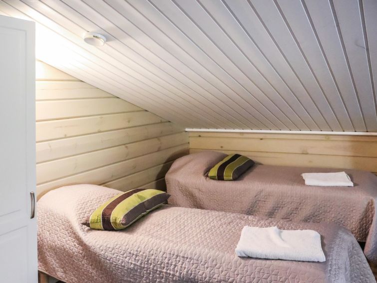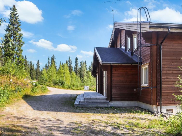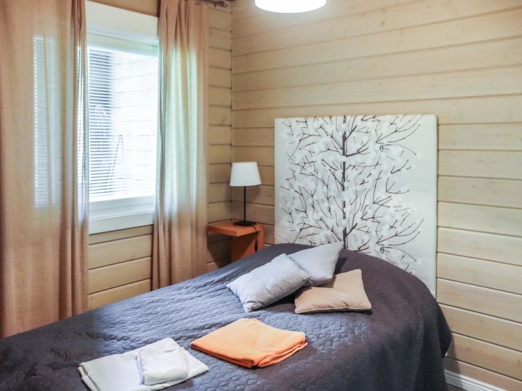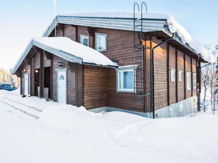 A semi-detached house located in the Ukkohalla tourism centre, 160 m², for 14 persons, built in 2009. Kitchen, 5 bedrooms (3 on the loft), sauna, shower room, 2 separate toilets, dressing room, vestibule, terrace, fireplace. 2 bedrooms with 2 x 80 cm beds/room, 1 single bed (120 cm wide) in one of the bedrooms, one bedroom wiht 5 x 80 cm beds, one bedroom with one 80 cm bed and a double bed (140 cm). Price includes 1 bag of firewood. Ukkohalla: Tourism centre located by Lake Syväjärvi, with an information centre, store, restaurant, spa, slope centre, snowmobile tracks, ski tracks, programme services, beach (further information at www.ukkohalla.fi). Distance to the Ukkohalla services 1 km. Kajaani airport 86 km, Oulu 170 km, Helsinki 650 km, bus stop Hyrynsalmi 18 km, railway station Kontiomäki 66 km.