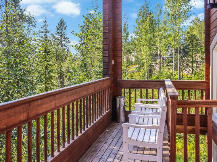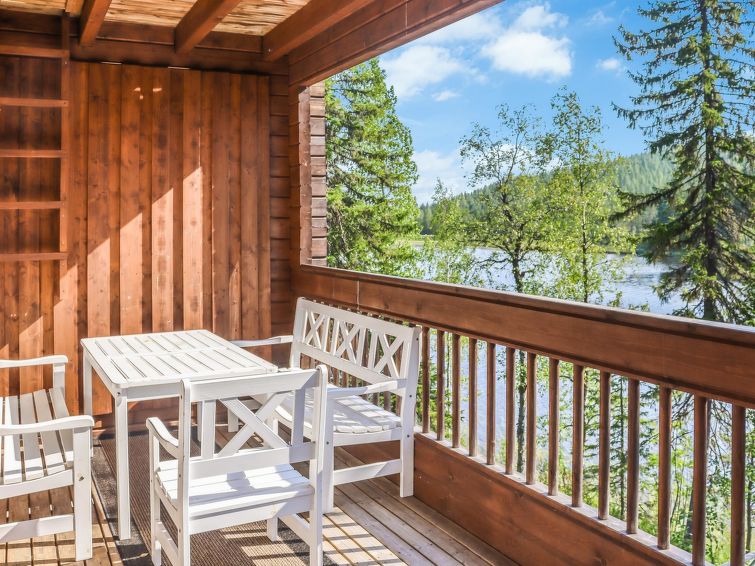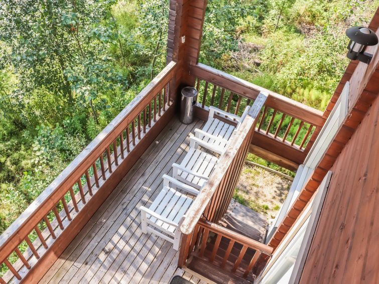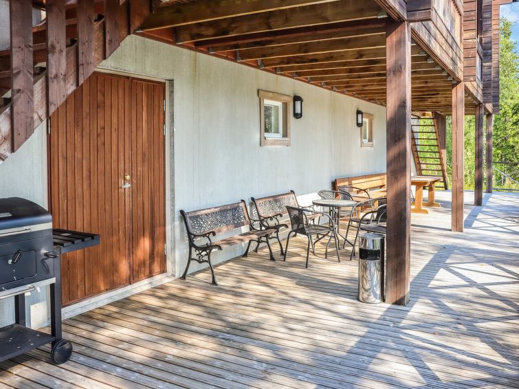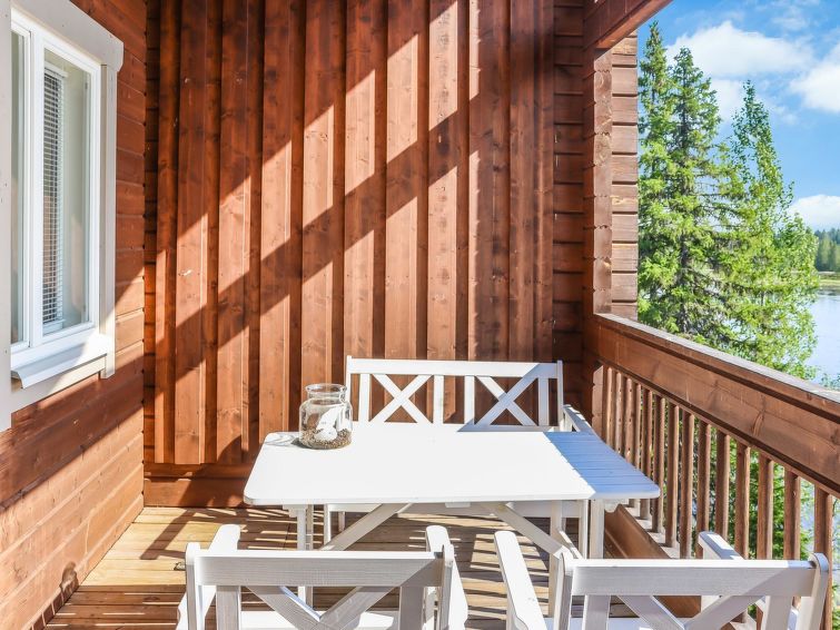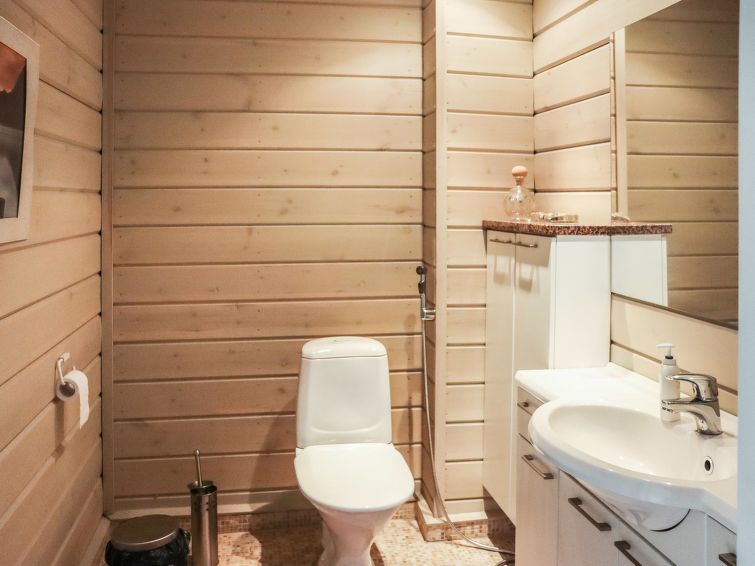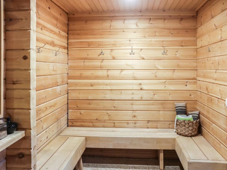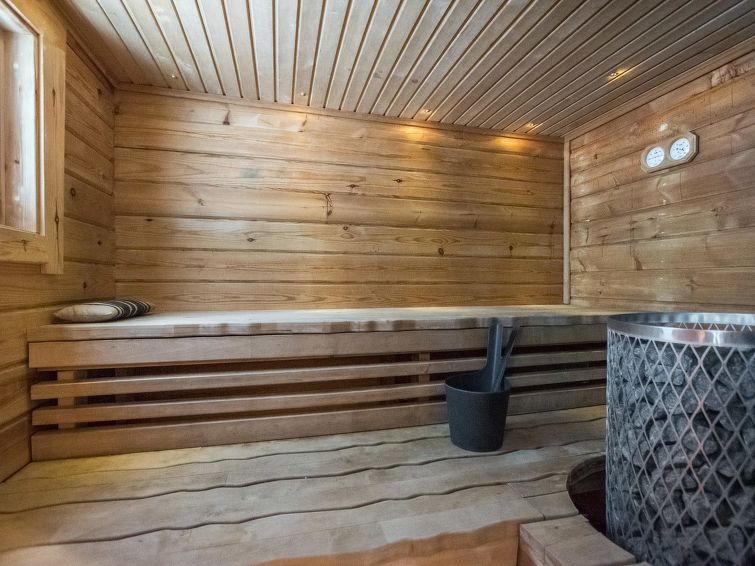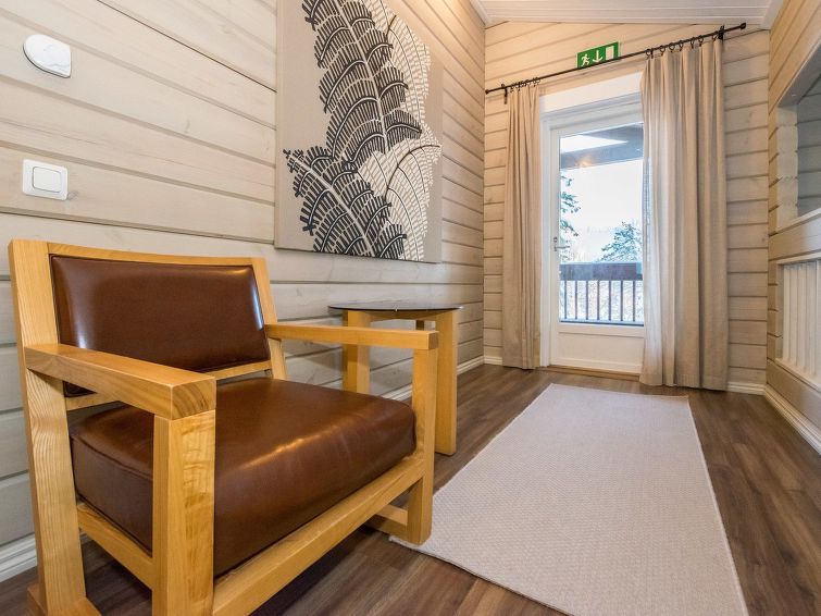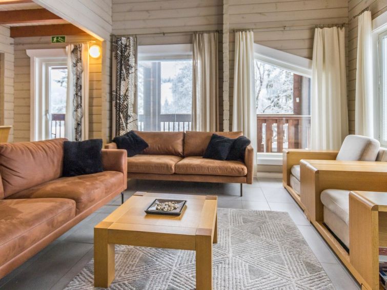 A semi-detached house located in the Ukkohalla tourism centre, 160 m², for 14 persons, built in 2009. Kitchen, 5 bedrooms (3 on the loft), sauna, shower room, 2 separate toilets, dressing room, vestibule, terrace, fireplace. 2 bedrooms with 2 x 80 cm beds/room, 1 single bed (120 cm wide) in one of the bedrooms, one bedroom wiht 5 x 80 cm beds, one bedroom with one 80 cm bed and a double bed (140 cm). Price includes 1 bag of firewood. Ukkohalla: Tourism centre located by Lake Syväjärvi, with an information centre, store, restaurant, spa, slope centre, snowmobile tracks, ski tracks, programme services, beach (further information at www.ukkohalla.fi). Distance to the Ukkohalla services 1 km. Kajaani airport 86 km, Oulu 170 km, Helsinki 650 km, bus stop Hyrynsalmi 18 km, railway station Kontiomäki 66 km.