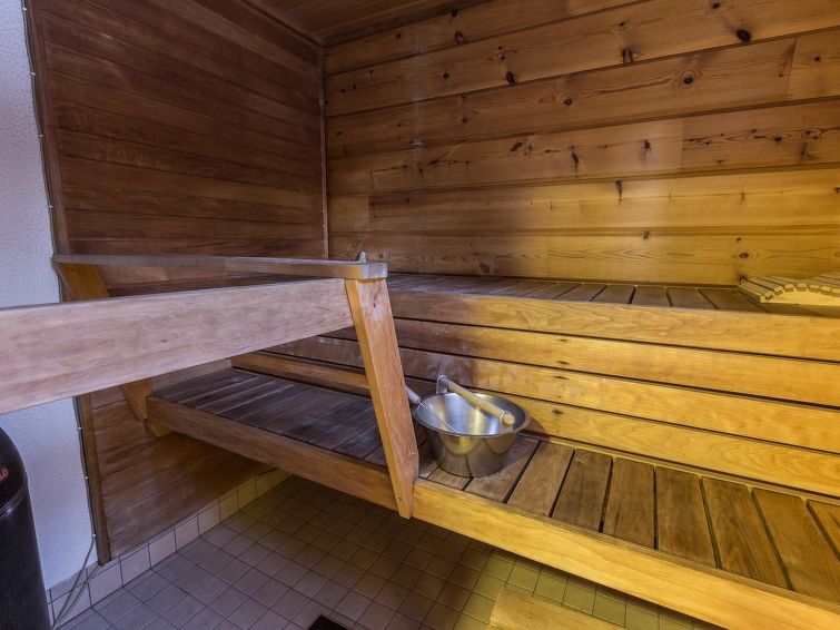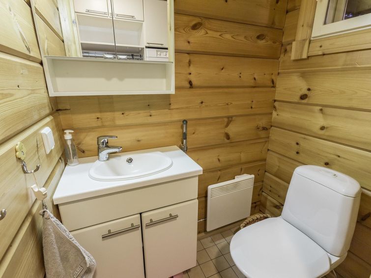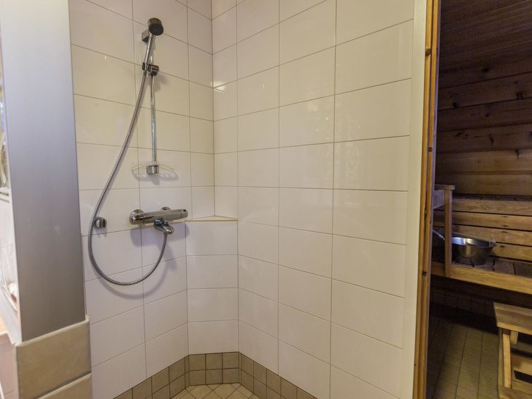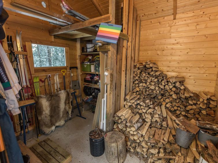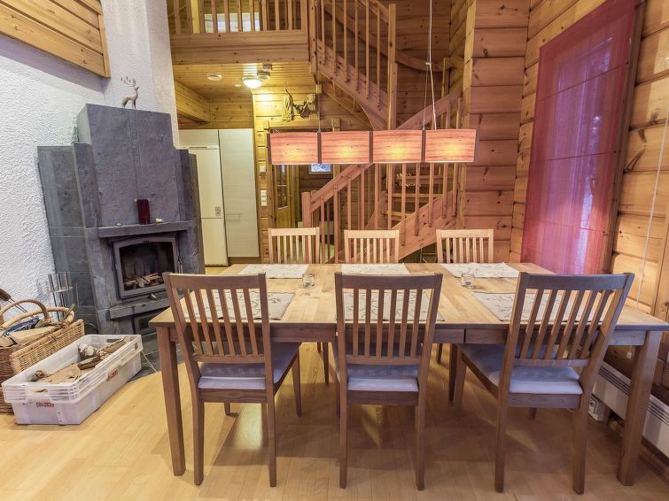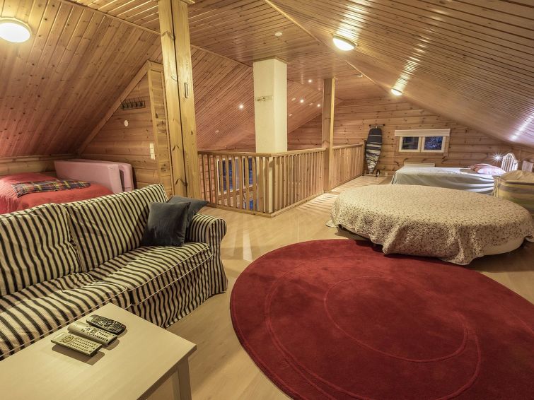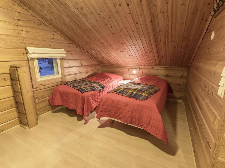 Approx. 40 km north of Kolari at Kaulavaara in Äkäslompolo village, log cottage. Area 109 m² of which 30 m² on the loft. Built in 2003. Well-equipped kitchen. Downstairs: 2 separate bedrooms, one with double bed (160x200 cm), other with 2 separate single beds (90x200 cm). Upstairs: 2 beds (90x200 cm), 1 double bed (140x200 cm) and a circular bed (diameter 210 cm). Separate storeroom with ski waxing rack. There are 4 kick sledges ( 2 for adults and 2 for children) for clients use.