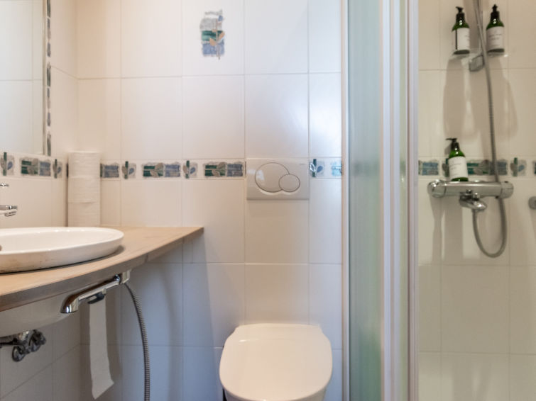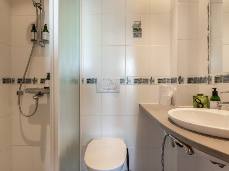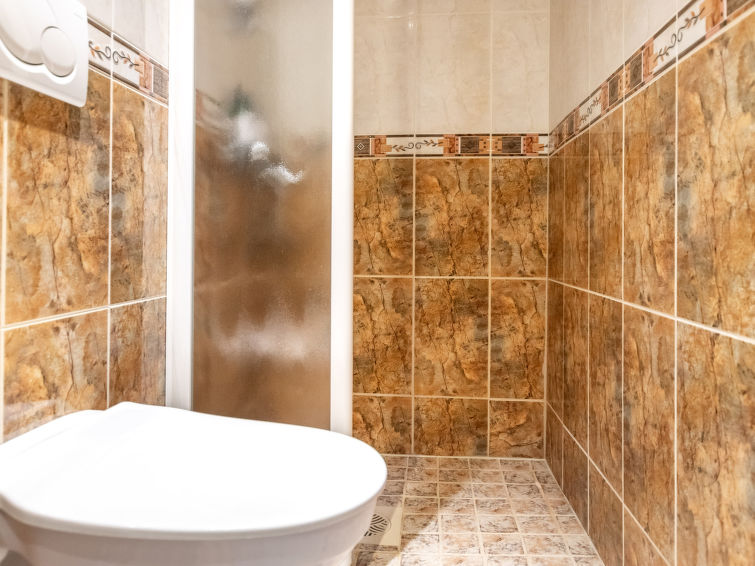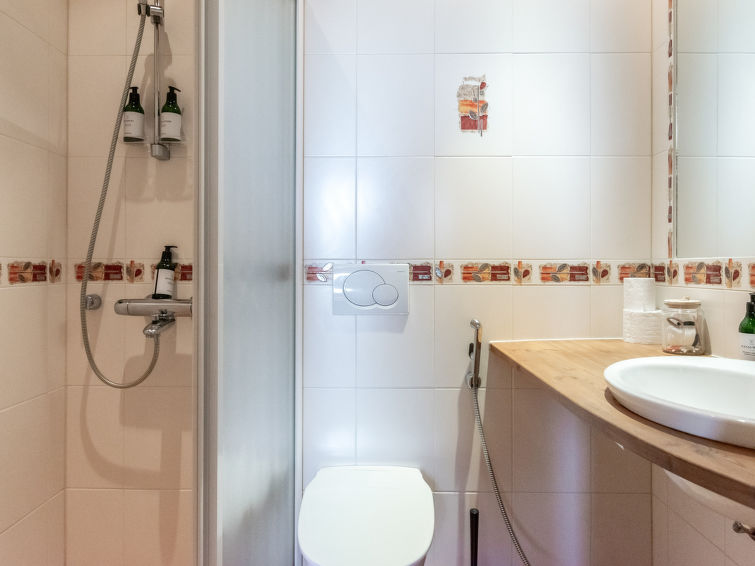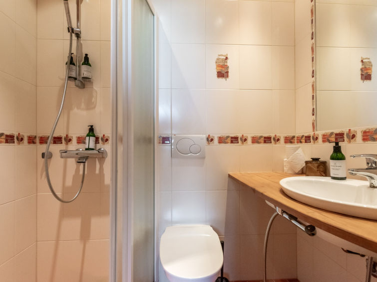 Bedrooms: 3 bedrooms on the entrance floor, each with 2 beds/room and shower/toilet. Downstairs, 5 bedrooms, each with 2 beds/room and shower/toilet. Easy access stairs to the lower floor.
