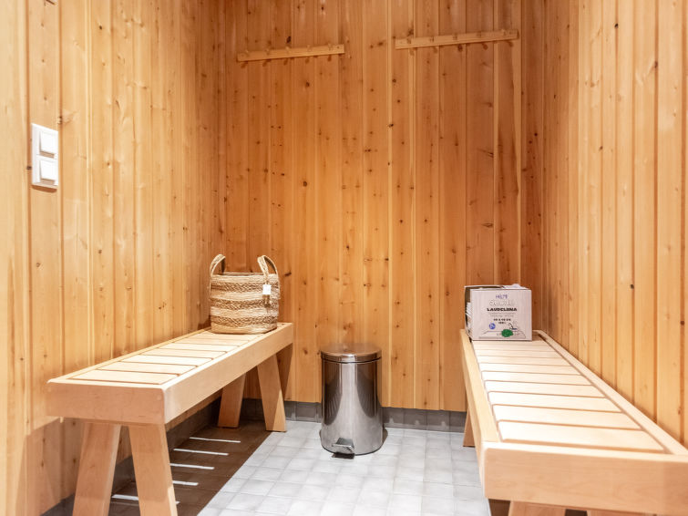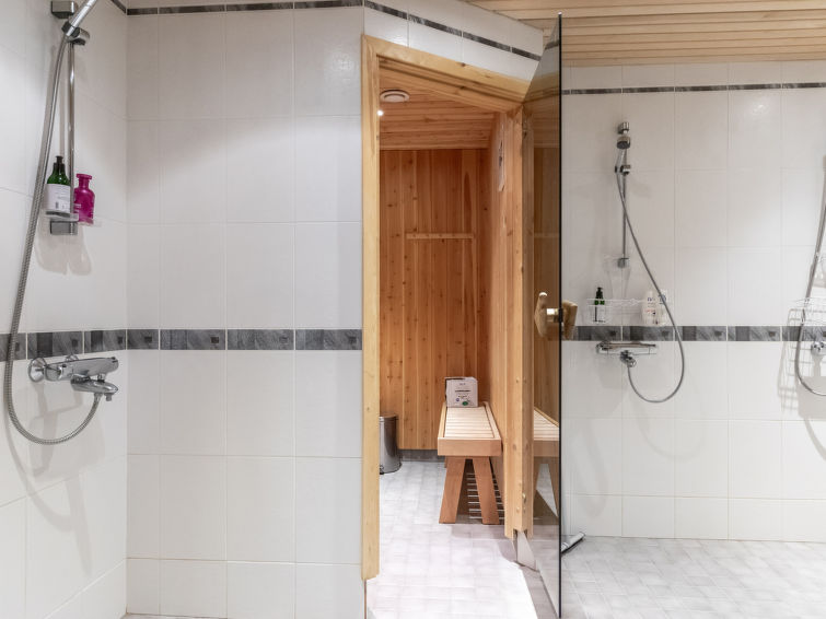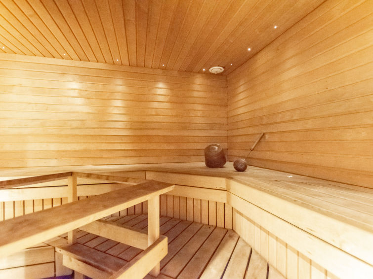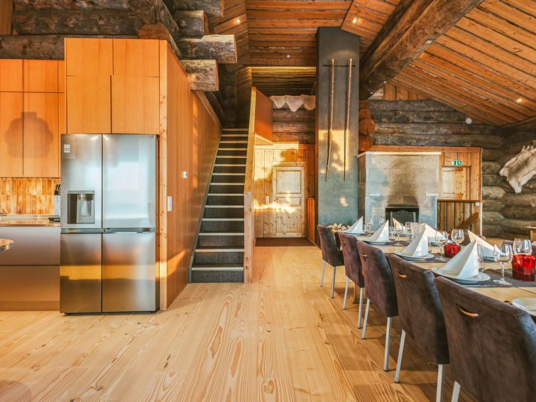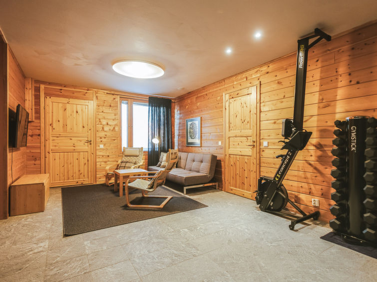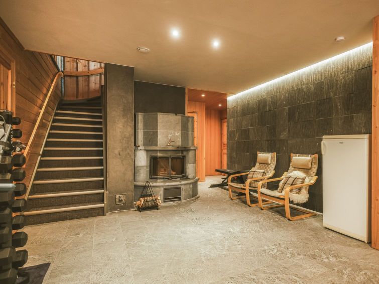 The entrance floor has also a kitchen and a 90-square-meter living area with a dining table for 14 people and a fireplace. Downstairs there is also a fireplace room/meeting room, a sauna section and a ski maintenance room.