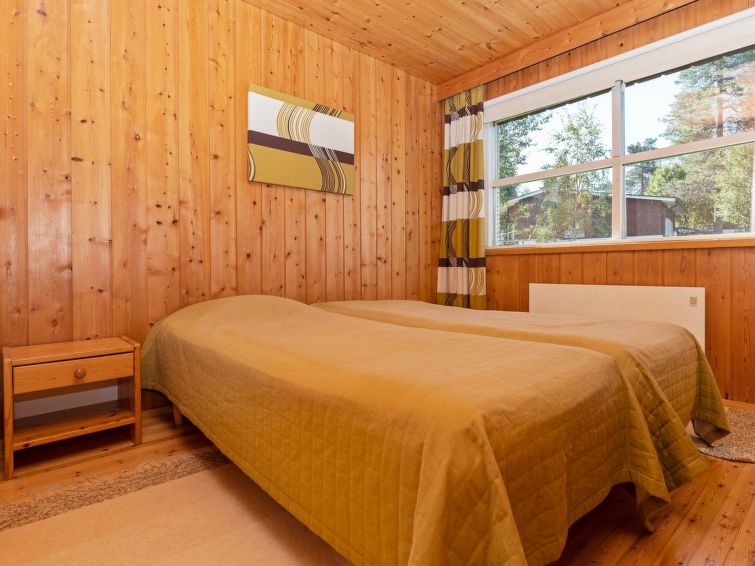 28 km north of Kuusamo, Ruka 6.5 km, Valkeisenlampi pond 40 m, rock/mud bottom beach, quickly becomes deeper, good pier. Plank-built holiday apartment, built in 1988, kitchen fixtures and beds renovated in 2007. Bedroom 1: 2 beds and bunk bed, bedroom 2: 2 beds, combined kitchen/living room, electric sauna. Situated on Valkeisrinne area. Other cottages in the area. Nearest ski lift is Pessari, which can be reached by skiing down the steep slope and over the ice of Yli-Pessari -pond.