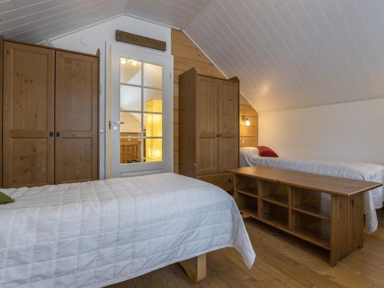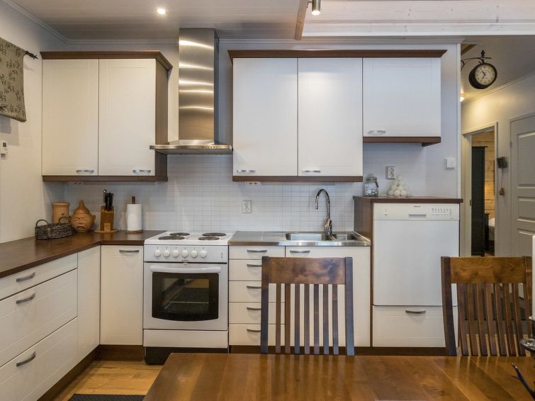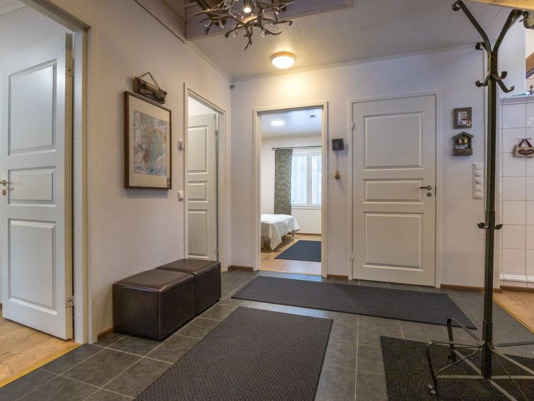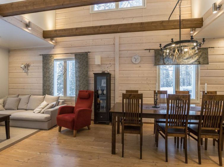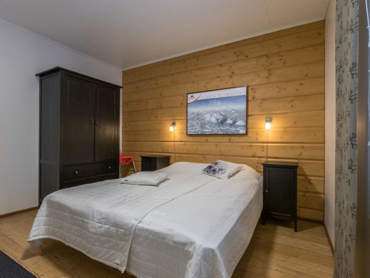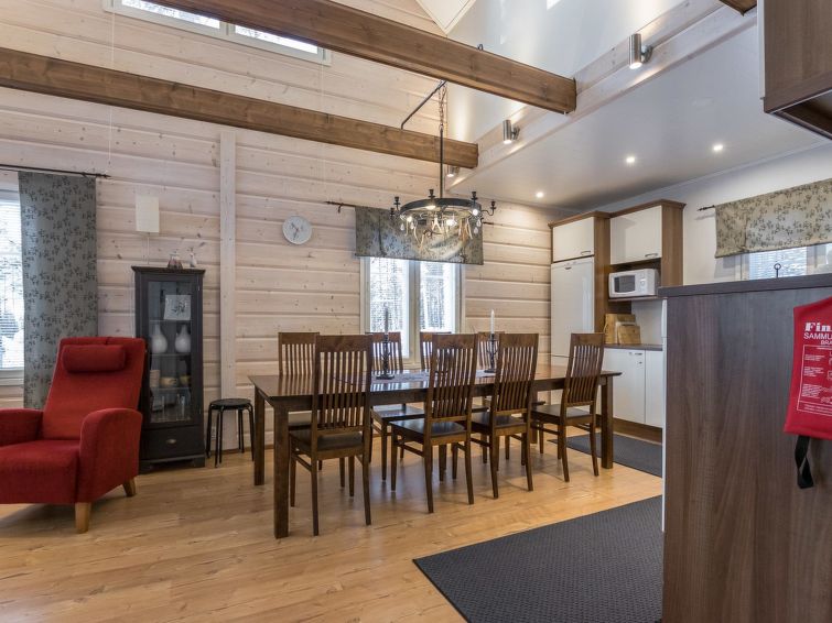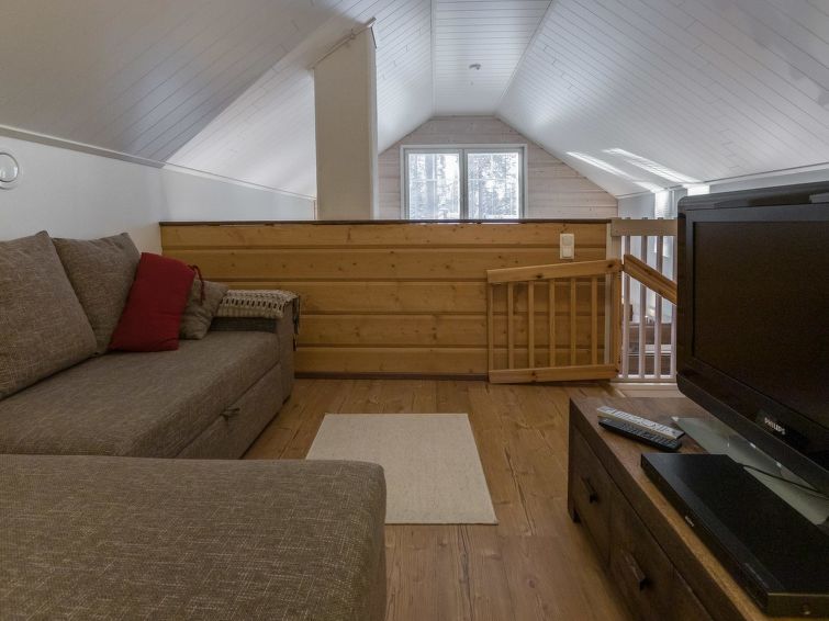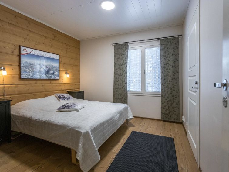 40 km north-east of Kolari, lake Ylläsjärvi 3 km, swimming beach 4,5 km. Log cottage, built 2008. Area 120 m² of which 26 m² on the loft. Livingroom/kitchen, in downstairs two bedrooms each with two separate beds, loft with 1bedroom with four separate beds and hall extendable bed sofa, electic sauna, shower, separate toilet. In addition: lockable ski storage and ski maintenance room.
