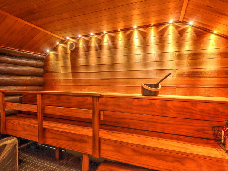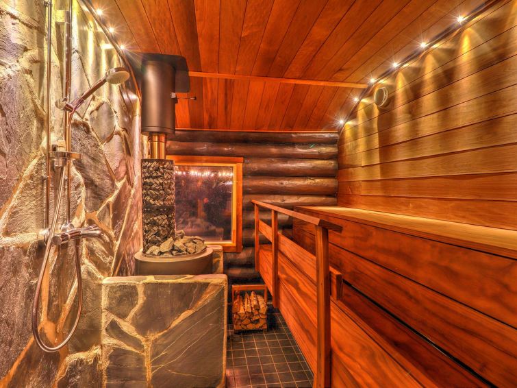 Lakeside sauna with shower in the sauna room, dressing area. The sauna has wood-burning sauna stove and underfloor heating.