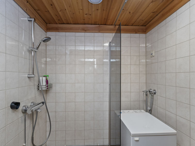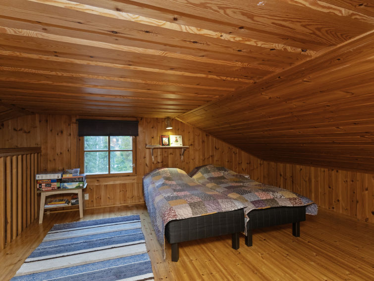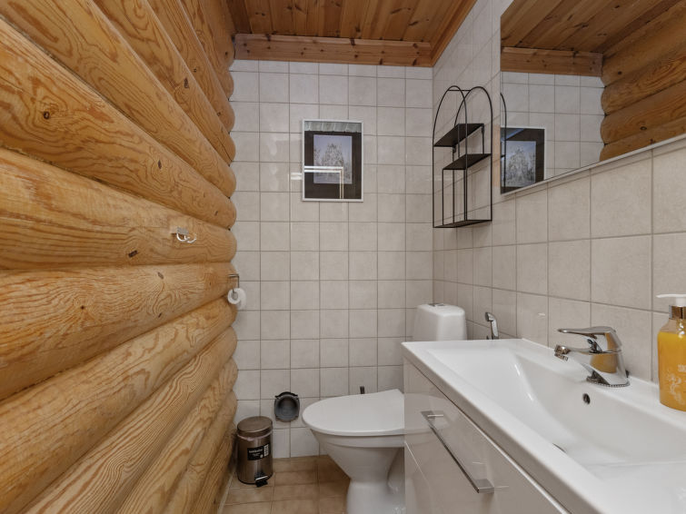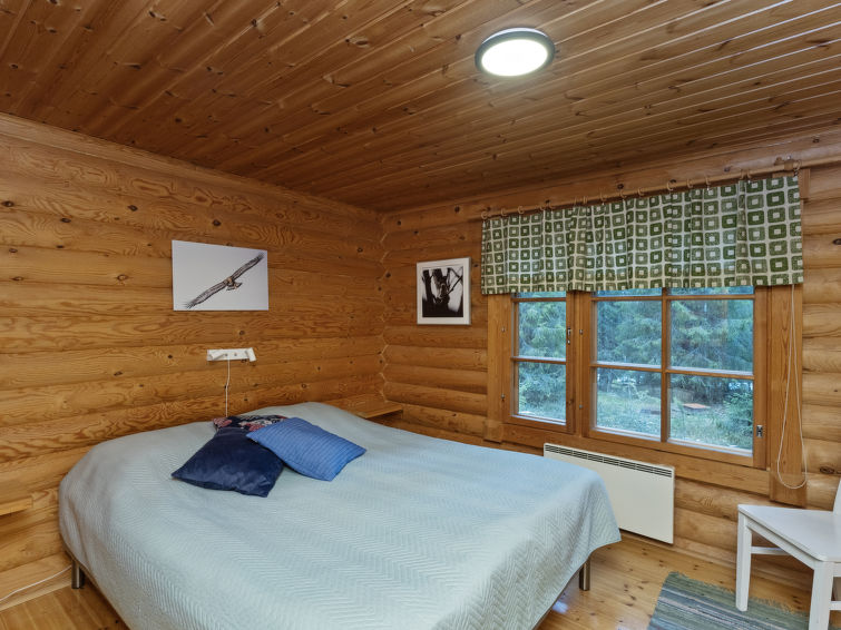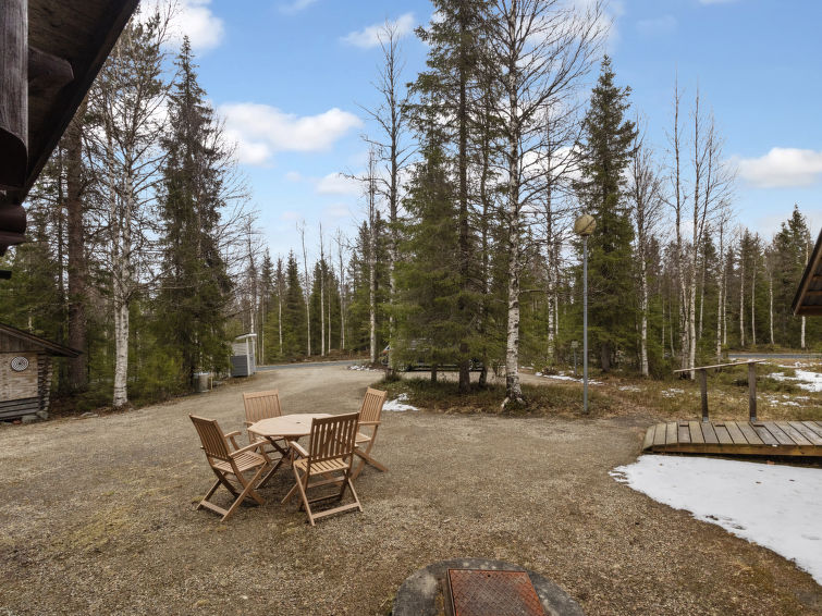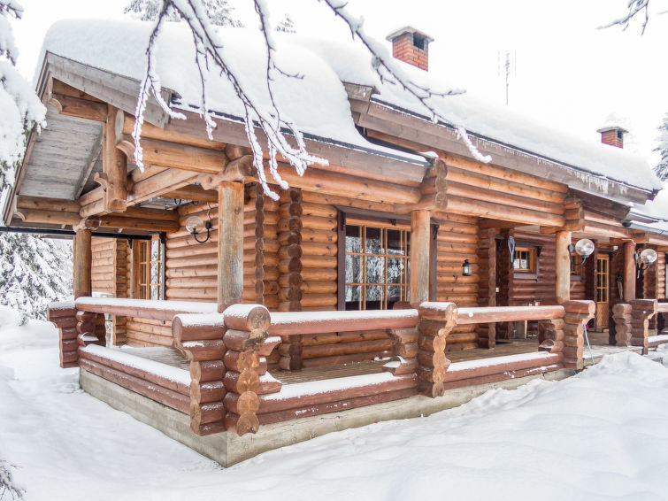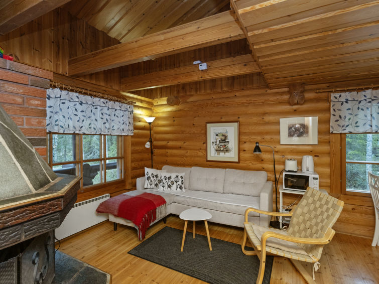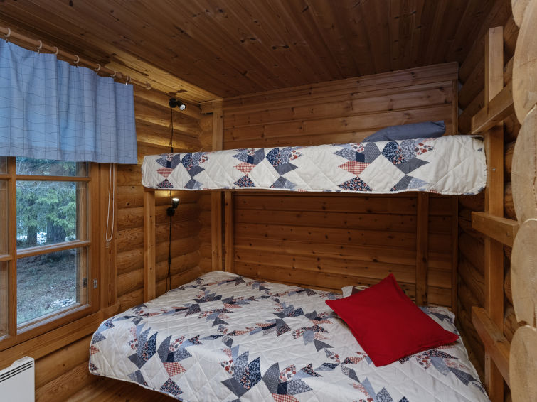 38 km north of Kuusamo, Ruka 13,5 km, Lake Porontimajärvi 100 m, rowing boat in shared use. Log-built apartment for 6, built in 1990, basic amenities, bedroom 1: double bed, bedroom 2: bunk bed (lower bed 140 cm), loft (15 m², low room height, steep stairs): 2 beds, combined kitchen/living room, electric sauna.