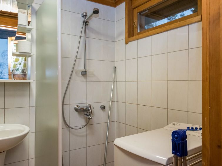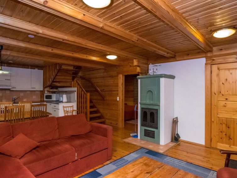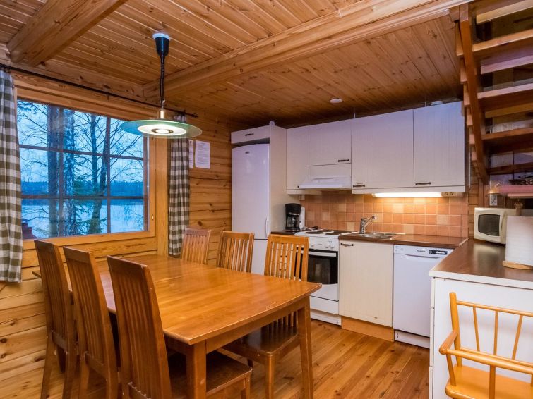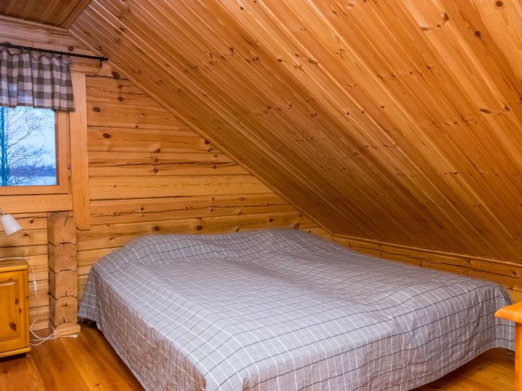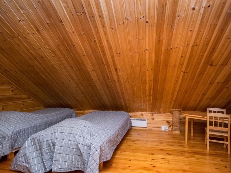 Log cabin 2006, living room / kitchen with sofa bed, 2 bedrooms with 2 beds in each (one downstairs, another upstairs), sleeping loft with 4 beds, wood-heated sauna, washroom, toilet downstairs and upstairs, covered porch.