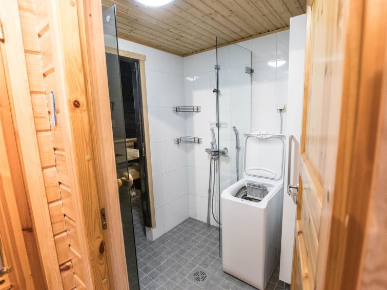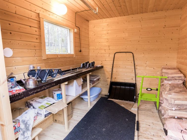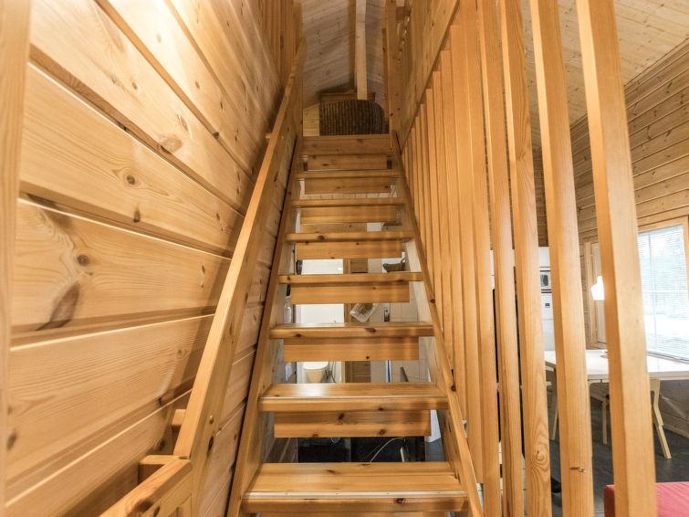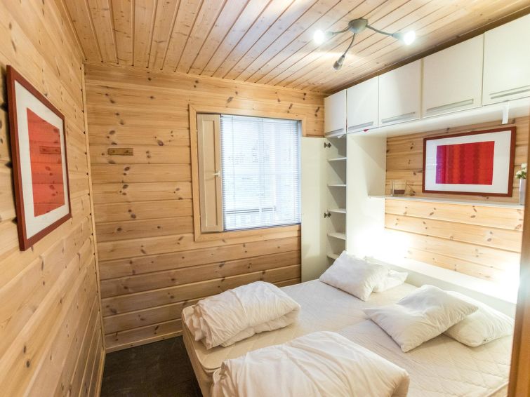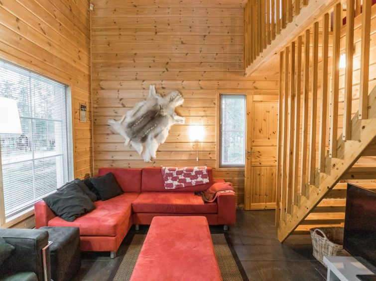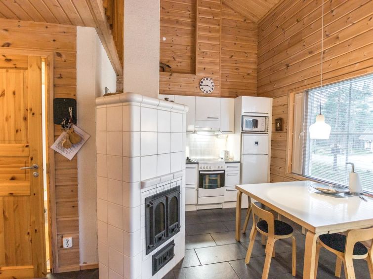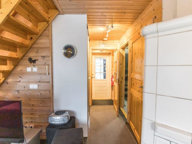 40 km north of Kolari, lake Äksälompolo 1,5 km, seimming beach 2,5 km. Log-panelled duplex apartment, built 2006. Area 51,5 m² of which 11 m² on the loft. Livingroom/kitchen with extendable bed sofa, one bedroom with two separate beds, loft with 2 separate beds and convertible sofa, electric sauna, shower, separate toilet. Ski maintenance room (ski waxing stand, infra-red heater). Homely log duplex apartment located in the Äkäslompolo village Kaulavaara area (address: Vaskoolikuja 2 A). The apartment is situated in a peacefu and neat cottage area. In addition: nursery equipment (feeding chair, nursing table, children's bath tub), DVD-player. No pets allowed. Prices include final cleaning, bed linen available for rent.