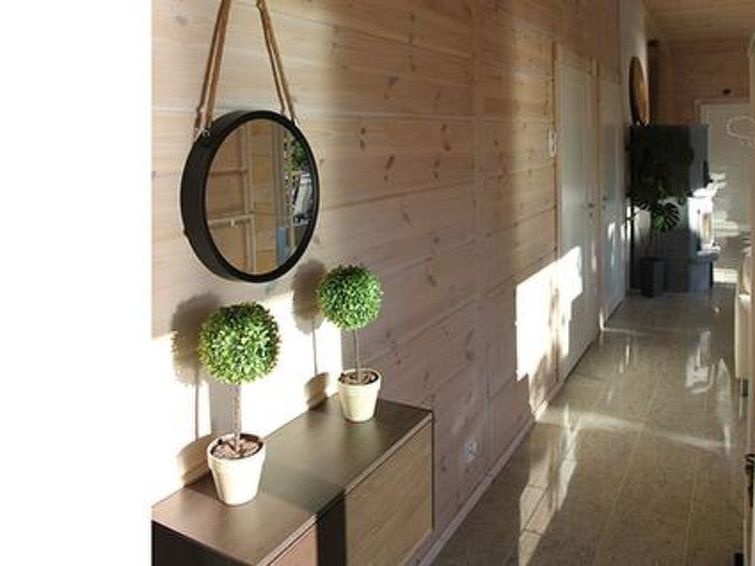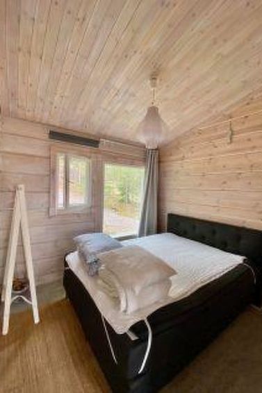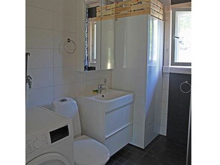 Thickset log house 2017, kitchen and spacious living room, bedroom with double bed, bedroom with double bed, bedroom with 2 separate beds, bedroom with bunk bed (top bed suitable only for children), washroom (toilet and shower), vestibule, broad terrace. The log house has underfloor heating and air source heat pump (also for cooling).