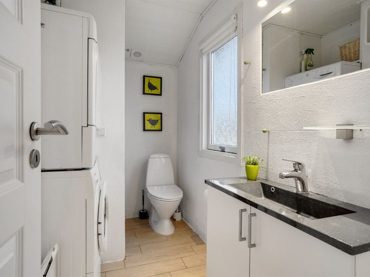Enmannsbolig, bygget i 1976. 250 m fra sjøen. Privat: tomt 1'400 m2. Terrasse (30 m2), lekeplass (huske). I huset: vaskemaskin, tørketrommel. Parkering ved hbrukt. Daglivarehandel 1.7 km.