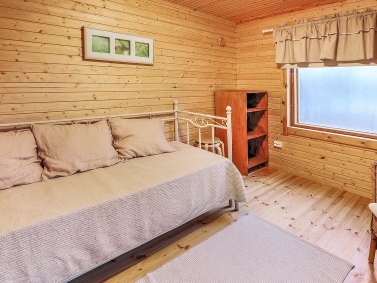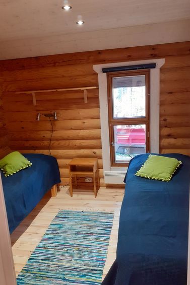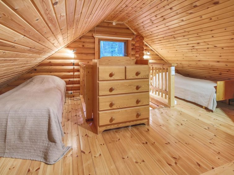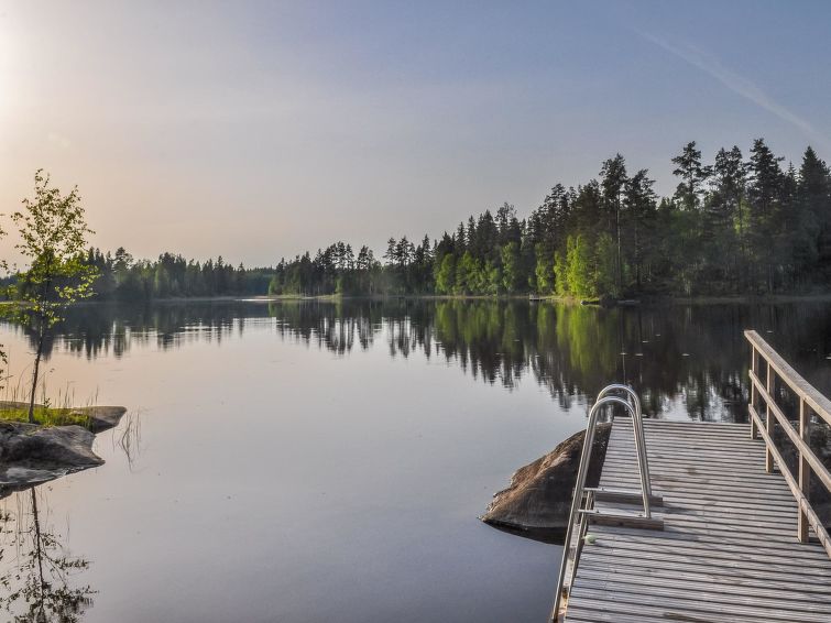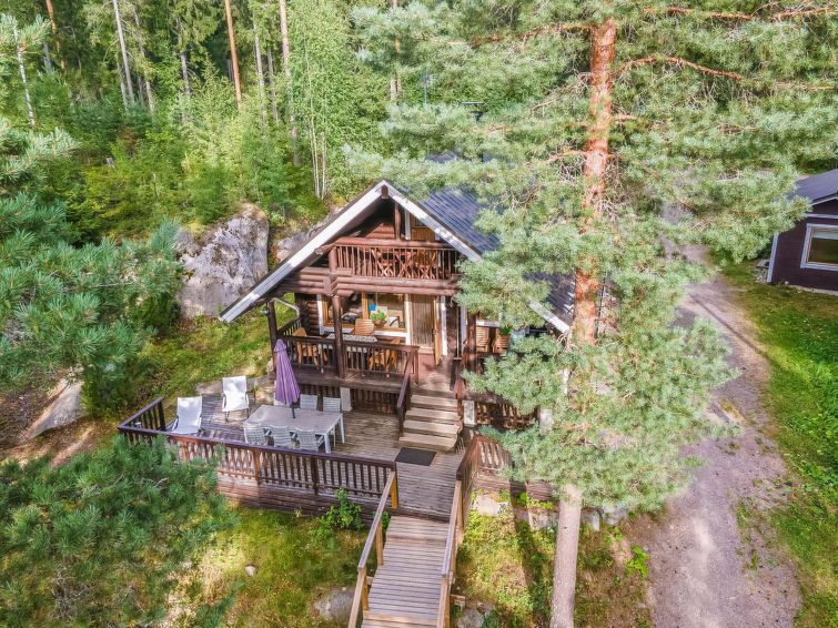 Final cleaning is included in bookings made from 10.1.2022. Roundlog chalet sheltered by bedrock, with jetty and bare rock ideal for sunbathing. Floor area 50 m² downstairs and 20 m² upstairs. Small separate sauna, in winter water must be brought from the cottage. For children shallow swimming shore. On owner’s land (100 ha), trails suitable for snowmobiling, forest roads ideal for jogging, and forest trails. Please ask baby cot and high chair from the owner; there are 2 baby cots and 3 high chairs in shared use with 4 cottages (free of charge).