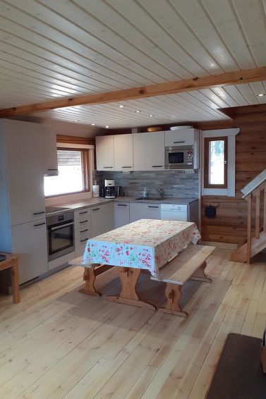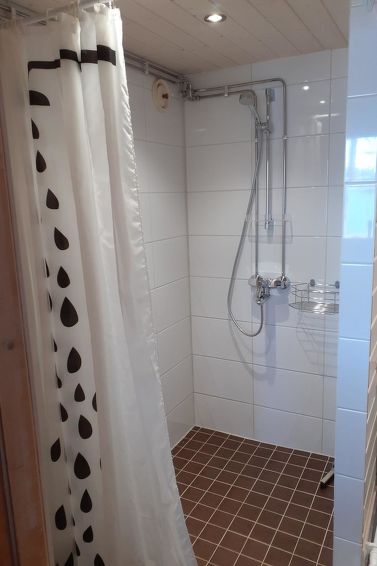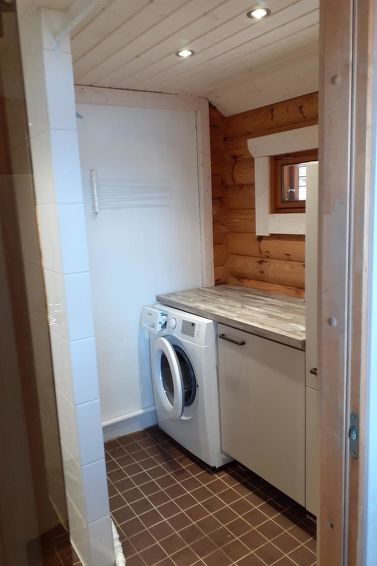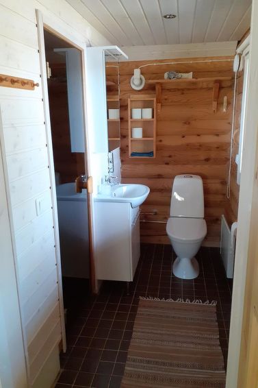 Log chalet 2009, living room/kitchen, bedroom twin bed, washroom, WC in dressing room, roofed open porch and large terrace. Upstairs: 4 beds and balcony. In sleeping hut (in summer use): convertible sofa for 2 persons, electricity and electric panel heating. Porch has gas-fired barbecue grill, water pipe from well.