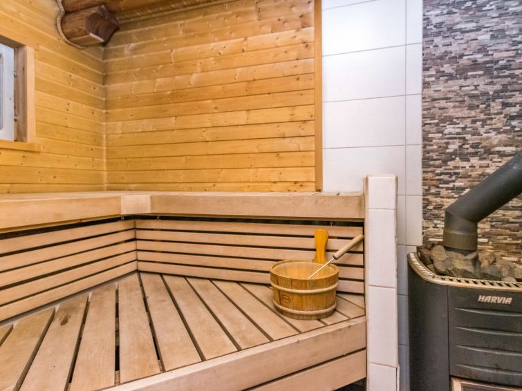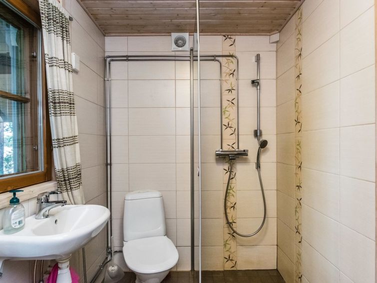Round log-built cabin 1997, living room/kitchen, bedroom (7 m²) on the ground floor has double bed, washroom with shower and WC, sauna with wood-burning sauna stove, covered porch. Loft with two mattresses, balcony.