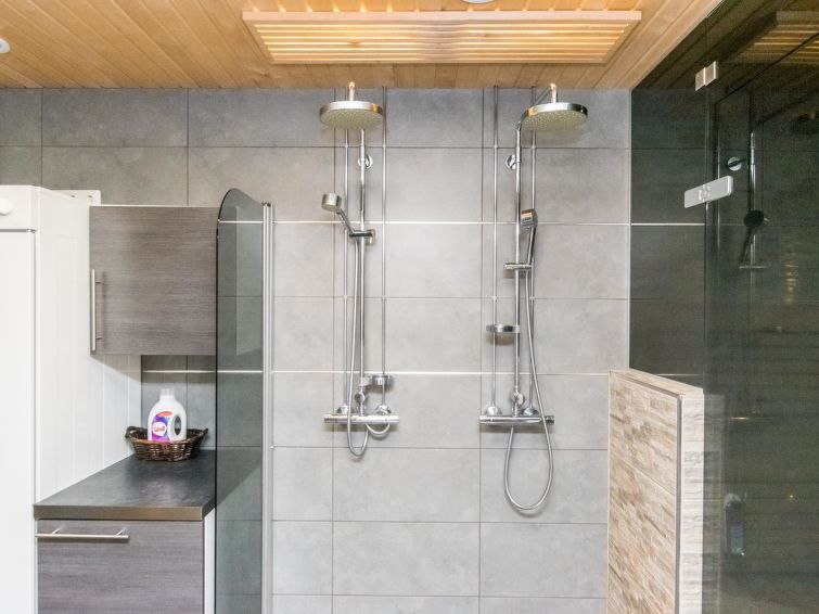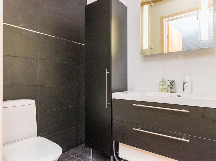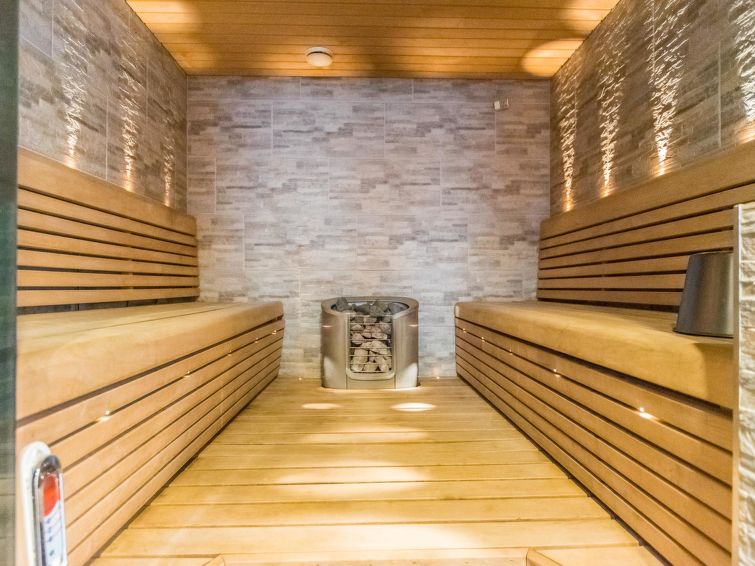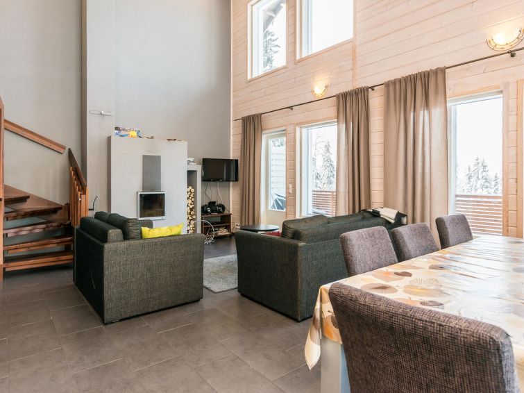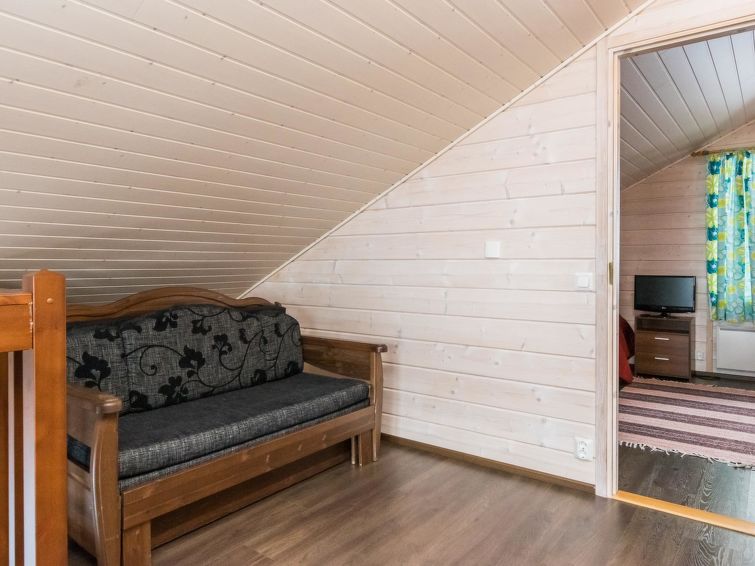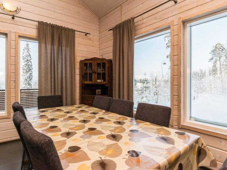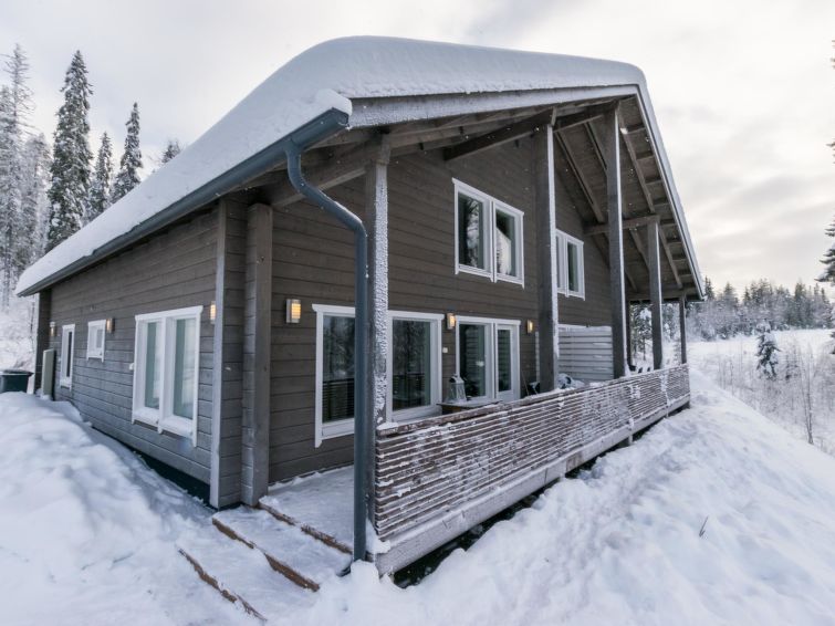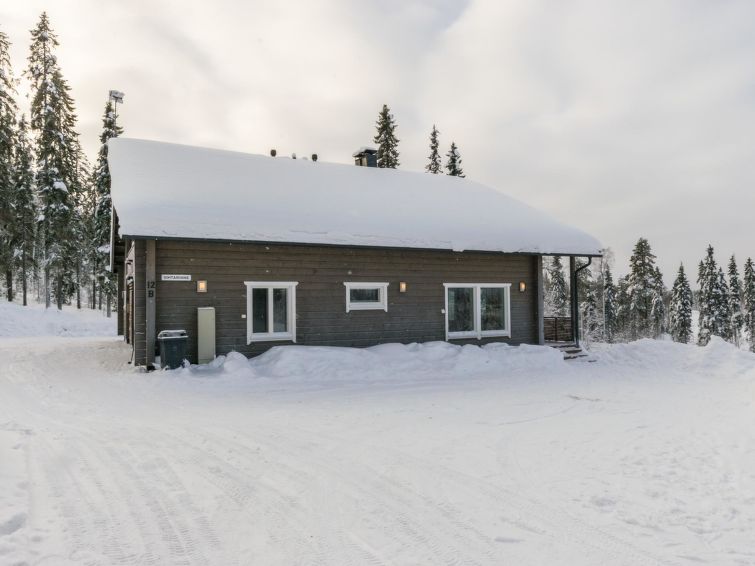 A semi-detached house located in the Ukkohalla tourism centre, 98 m², for 12 persons, built in 2012. Kitchen, 2 bedrooms (another upstairs), sauna, shower room (2 showers), 2 separate toilets (another upstairs), room for clothes, terrace, fireplace and firewood. Downstairs bedroom double bed, living room two sofa beds, upstairs bedroom douple bed and 2x80 cm beds, loft lobby with a sofa bed. Ukkohalla: Tourism centre located by Lake Syväjärvi, with an information centre, store, restaurant, spa, slope centre, snowmobile tracks, ski tracks, programme services, beach (further information at www.ukkohalla.fi). Distance to the Ukkohalla services 0.1 km. Kajaani airport 86 km, Oulu 170 km, Helsinki 650 km, bus stop Hyrynsalmi 18 km, railway station Kontiomäki 66 km.