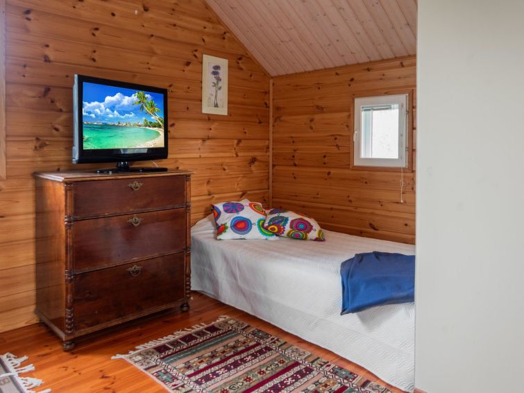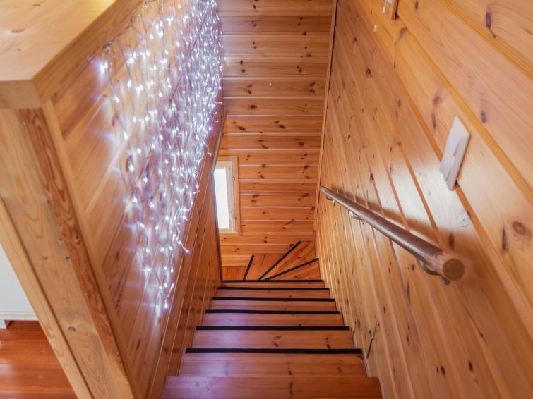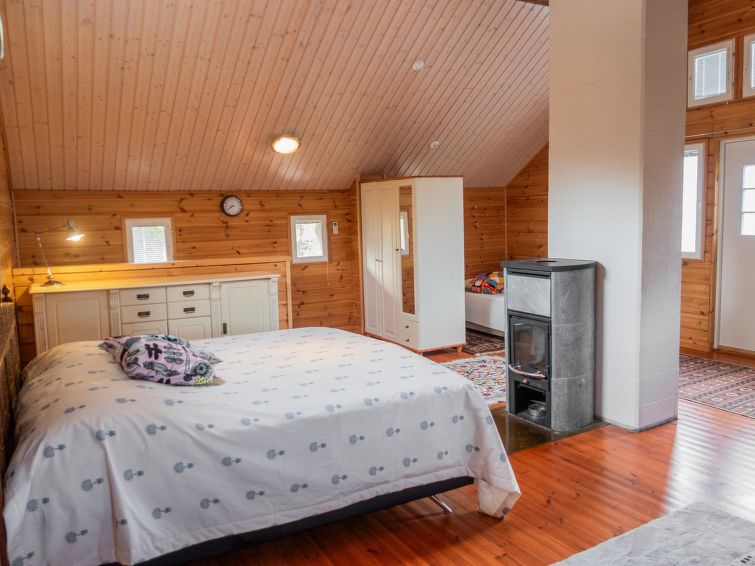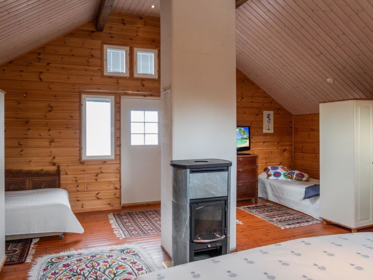 The cottage built in 2002, living space of 60 m² on the ground floor and 60 m² on upper floor. A separate kitchen corner with an atmospheric wood stove. In the living room kitchen there is a fireplace and a dining set for 6 people. In the living room, a good-sized sofa and an armchair. Upstairs, a motor bed (as a double bed), and 2 x 120 cm wide separate beds, in the same space, but partly demarcated into a sleeping space with wardrobe. From the upper floor there is access to a small balcony, with a view of the courtyard sauna and the stream.
