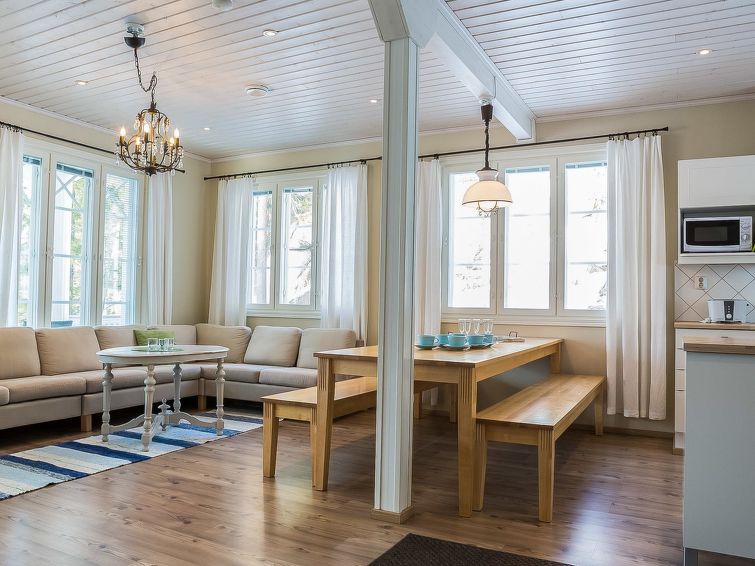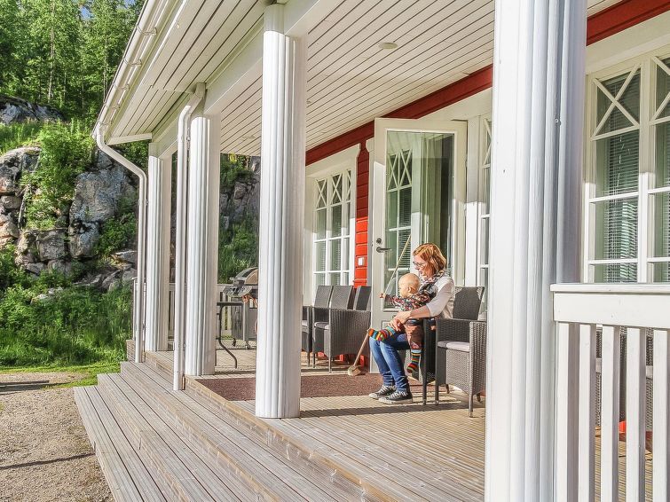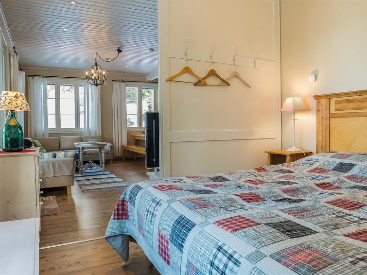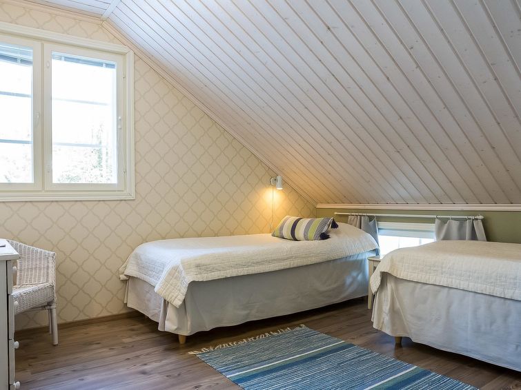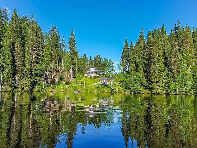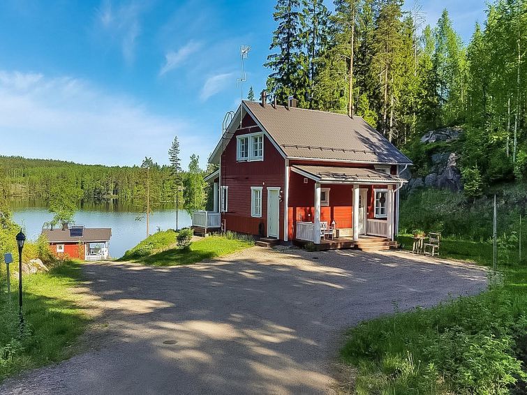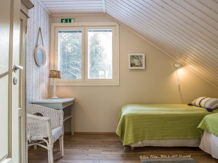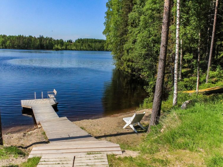 A wooden house and lake shore sauna 2011, on the ground floor a spacious kitchen, a bedroom with two beds, laundry room and terraces on both sides of the house. Upstairs 3 bedrooms with two beds each, living room, bathroom/wc/shower and balcony.