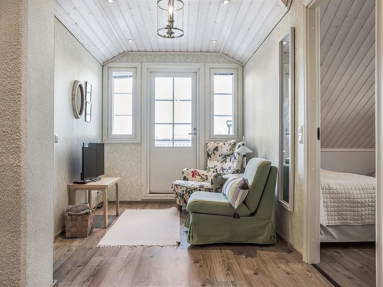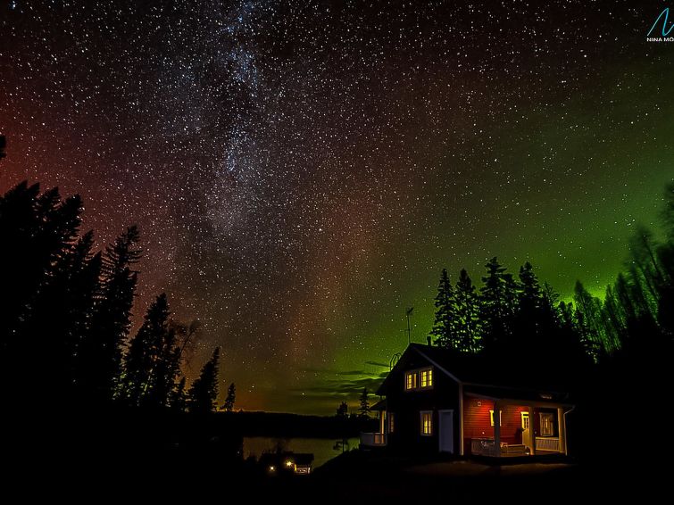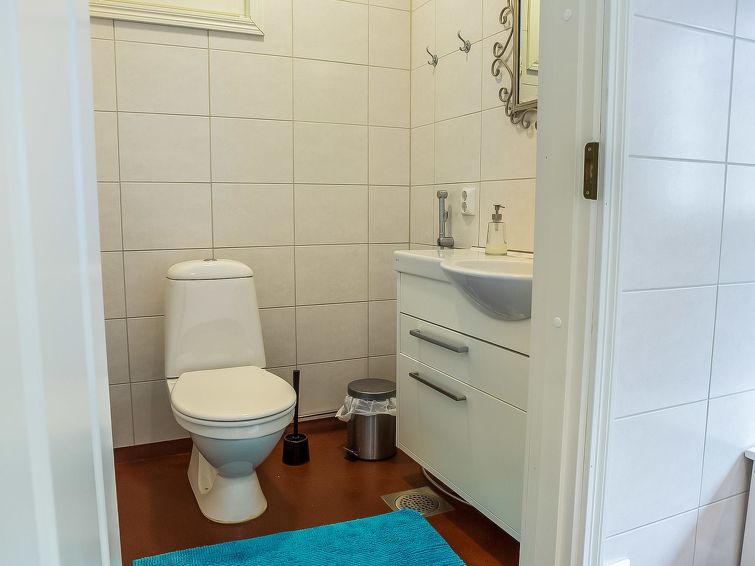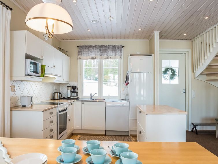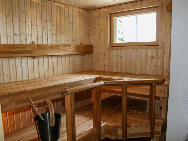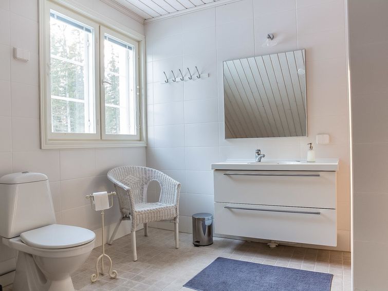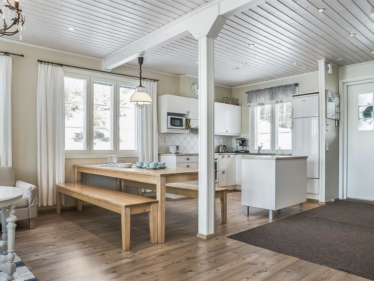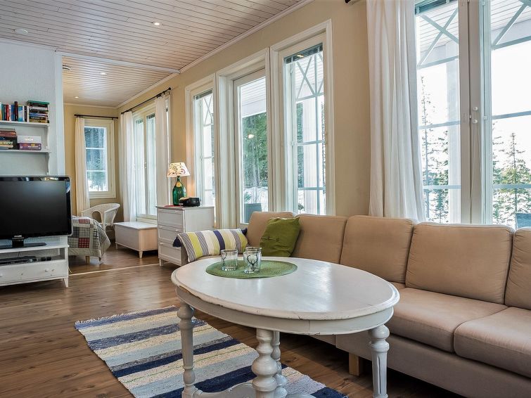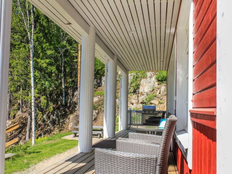 A wooden house and lake shore sauna 2011, on the ground floor a spacious kitchen, a bedroom with two beds, laundry room and terraces on both sides of the house. Upstairs 3 bedrooms with two beds each, living room, bathroom/wc/shower and balcony.