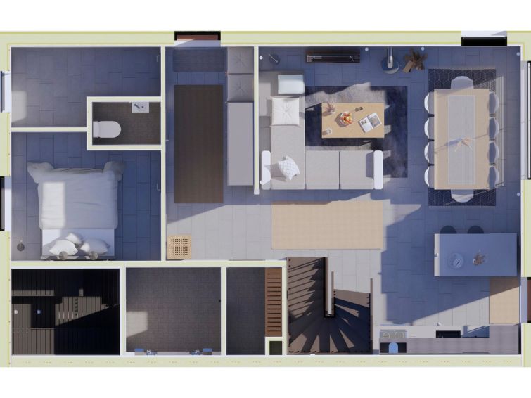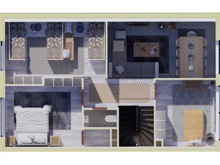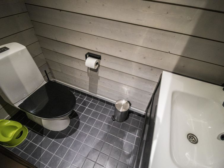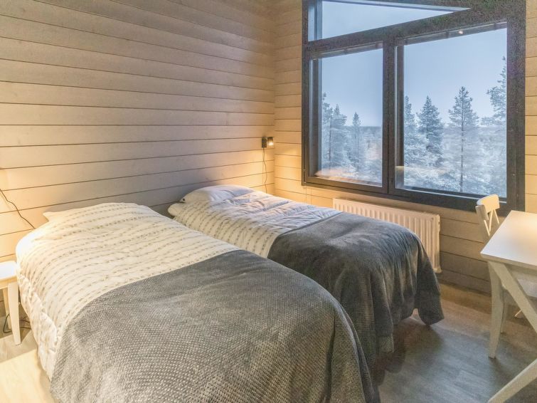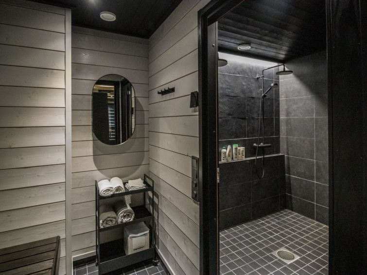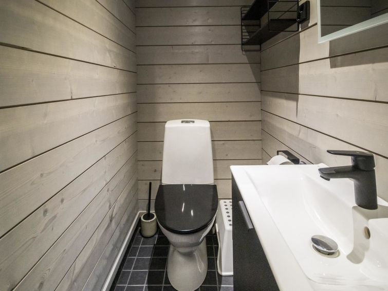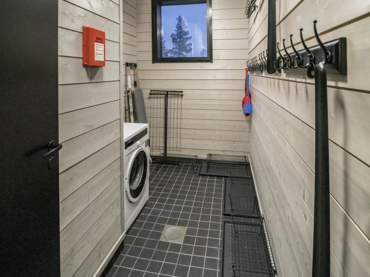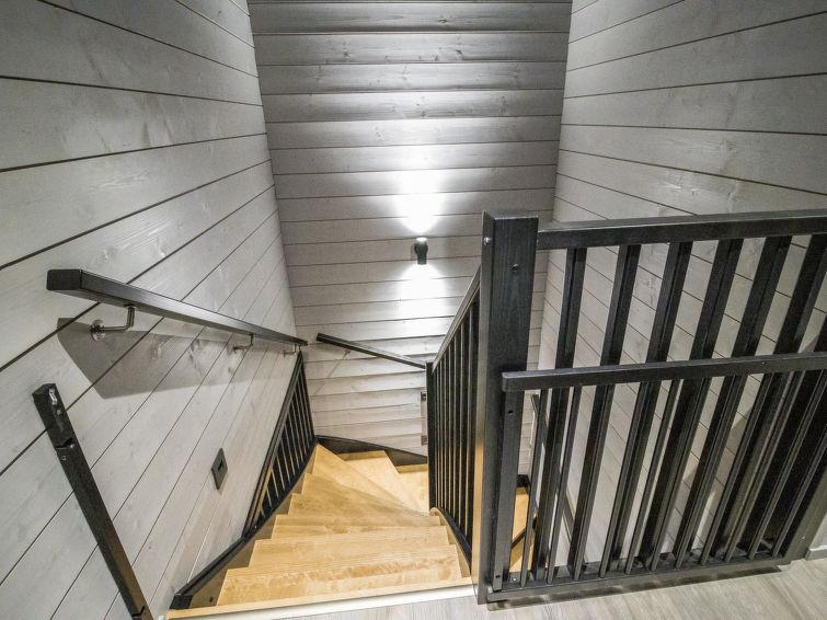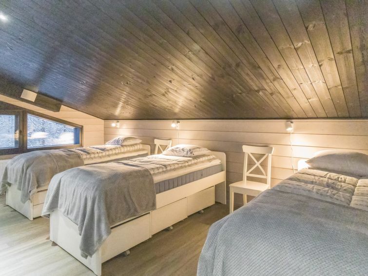Large living room/kitchen with fireplace. 4 bedrooms, three of them have two box spring beds and the fourth has three box spring beds. Space for 9 people. The third bedroom has two additional beds suitable for children. The extra beds are pulled out from under the box spring beds. 2 WCs, sauna, washroom with two showers and dressing room. Large room for drying and storing clothes and sport equipment. Large 3 0m² terrace with terrace furniture. Air source heat pumps in both floors.