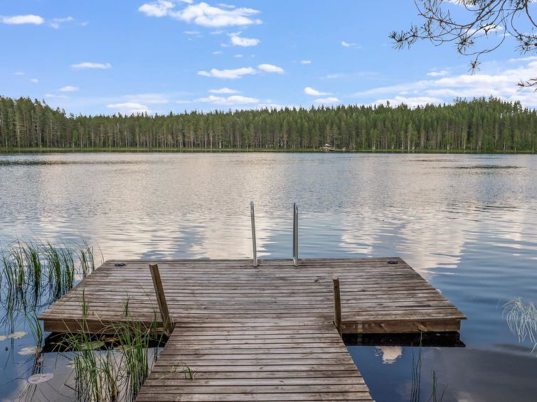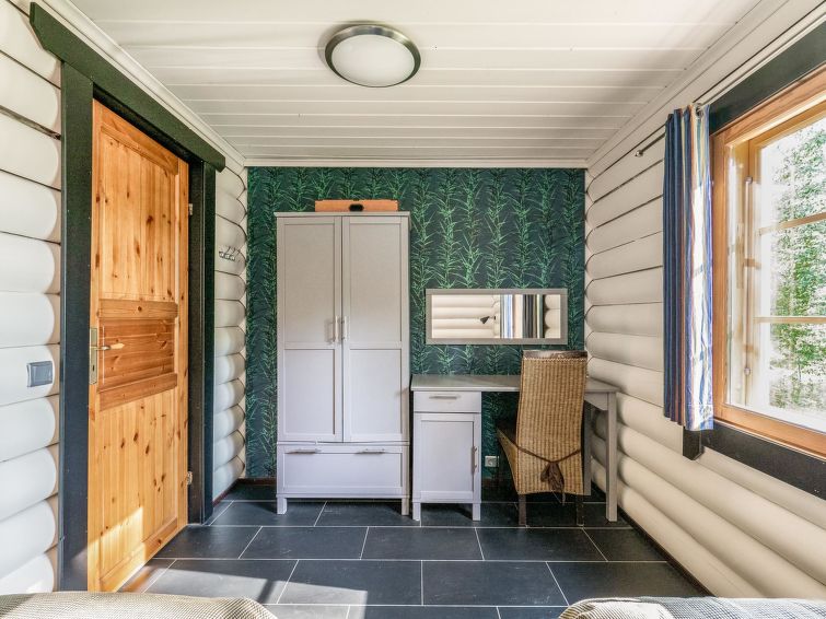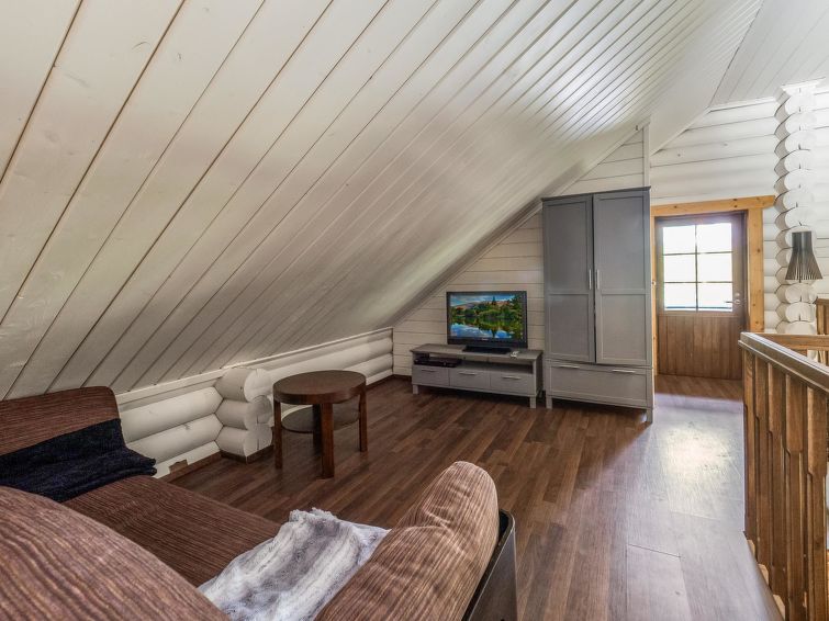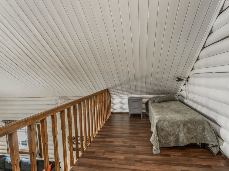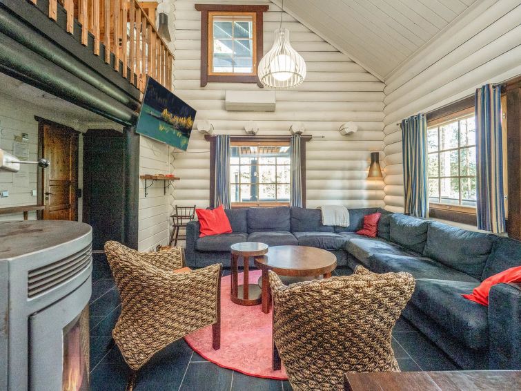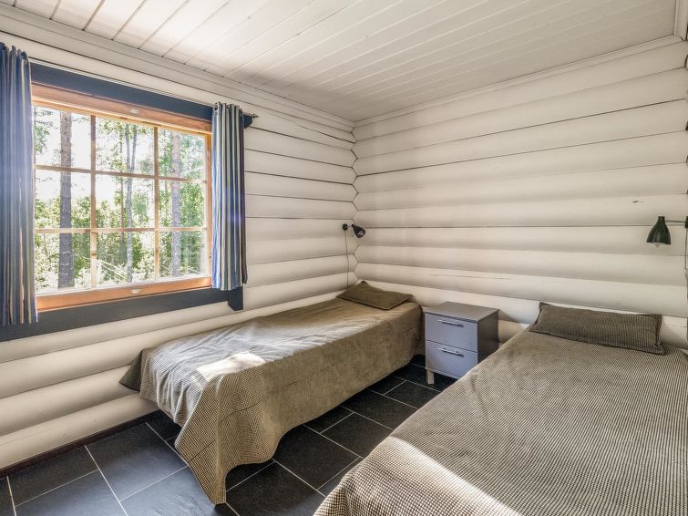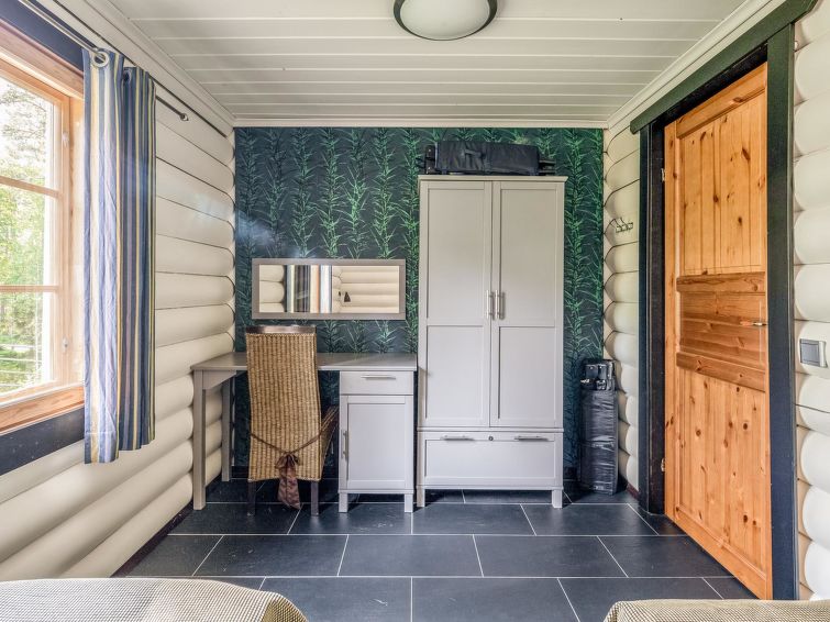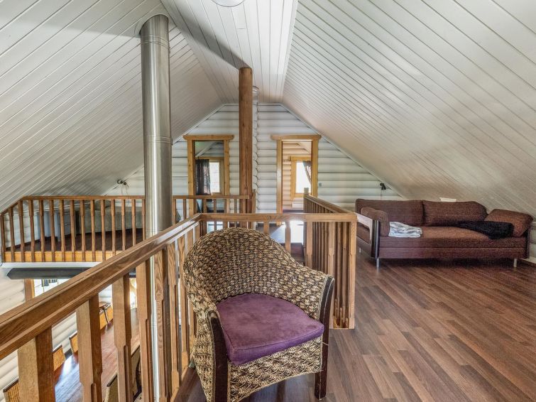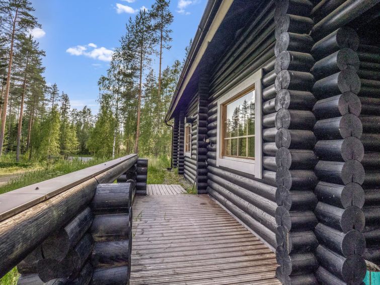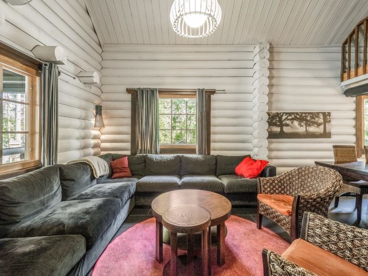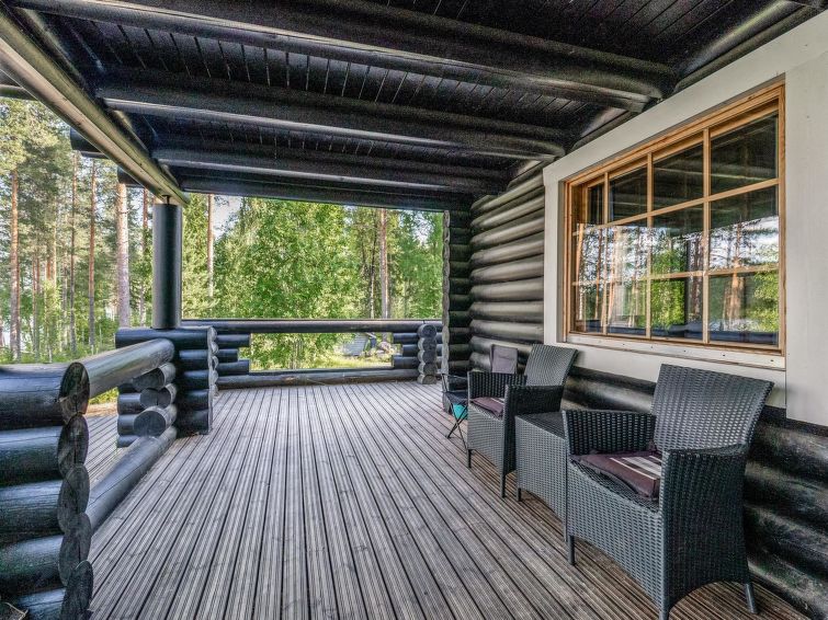 85 km west of Jyväskylä, L.Alasenjärvi 25 m (length 1.6 km, width 350 m), shallow, hard, sanded shore, own boat. Log chalet 2008, downstairs living room with angled 10-person sofa/settee suite, 47" flat screen TV, dining area table for 14 persons, kitchen section, 2 bedrooms 2 beds in each, separate WC, washroom 2 showers, sauna wood-burning stove, 32 m² terrace. Upstairs: 2 bedrooms 2 beds in each, hall/lobby area convertible sofa for 2 persons and 2 sofabeds for 1 person/each, separate WC, 3-piece suite, 32" flat screen TV, 24 m² balcony. Kitchen has e.g. ice cube maker, ceramic cooker top + oven. Downstairs: stone flooring with underfloor heating, heating pump/inverter air conditioning system for cooling and heating. Spacious, high standard chalet on pine-covered ridge, made and furnished with high quality materials. Suitable even for 3 families. Internet-connection (wireless, speed 4 Mb). Yard has hot tub for 7 persons.
