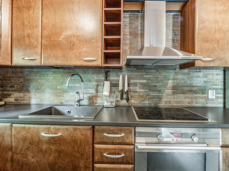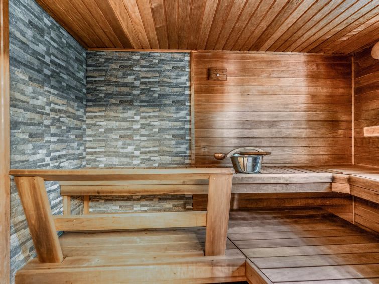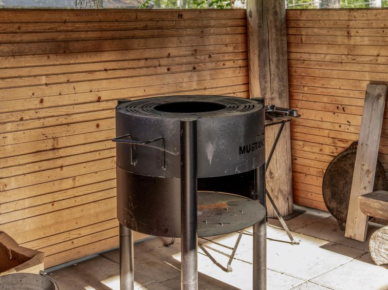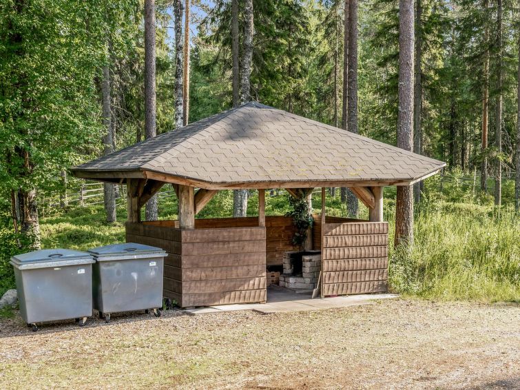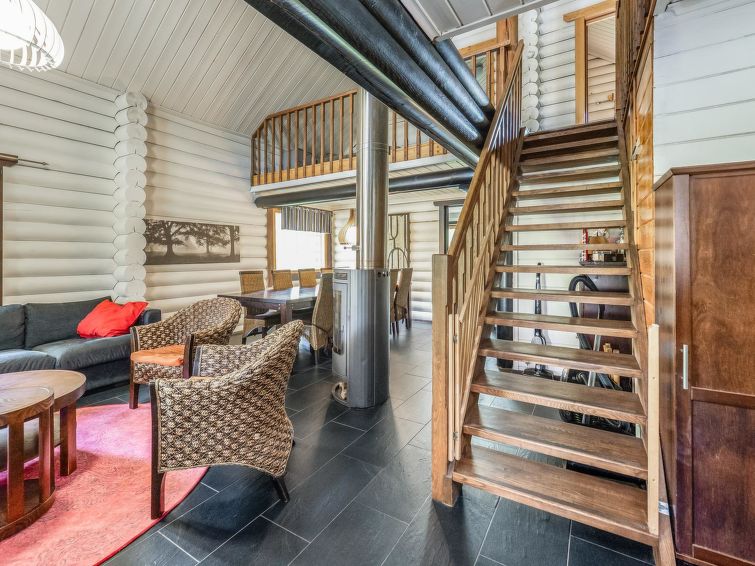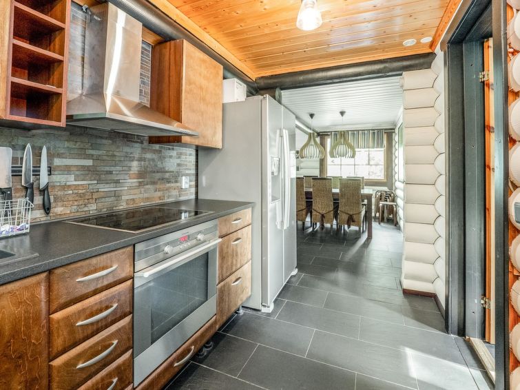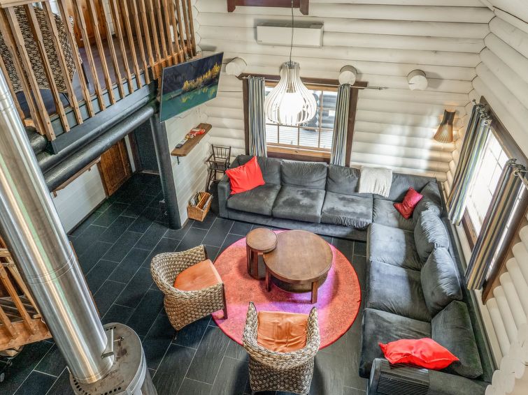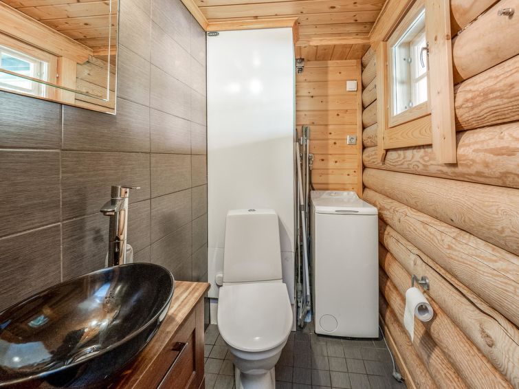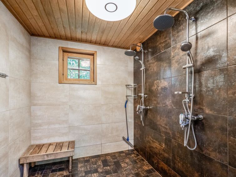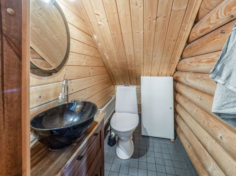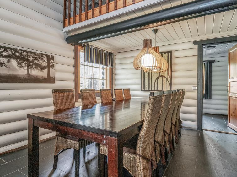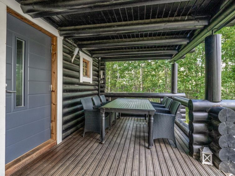 85 km west of Jyväskylä, L.Alasenjärvi 25 m (length 1.6 km, width 350 m), shallow, hard, sanded shore, own boat. Log chalet 2008, downstairs living room with angled 10-person sofa/settee suite, 47" flat screen TV, dining area table for 14 persons, kitchen section, 2 bedrooms 2 beds in each, separate WC, washroom 2 showers, sauna wood-burning stove, 32 m² terrace. Upstairs: 2 bedrooms 2 beds in each, hall/lobby area convertible sofa for 2 persons and 2 sofabeds for 1 person/each, separate WC, 3-piece suite, 32" flat screen TV, 24 m² balcony. Kitchen has e.g. ice cube maker, ceramic cooker top + oven. Downstairs: stone flooring with underfloor heating, heating pump/inverter air conditioning system for cooling and heating. Spacious, high standard chalet on pine-covered ridge, made and furnished with high quality materials. Suitable even for 3 families. Internet-connection (wireless, speed 4 Mb). Yard has hot tub for 7 persons.
