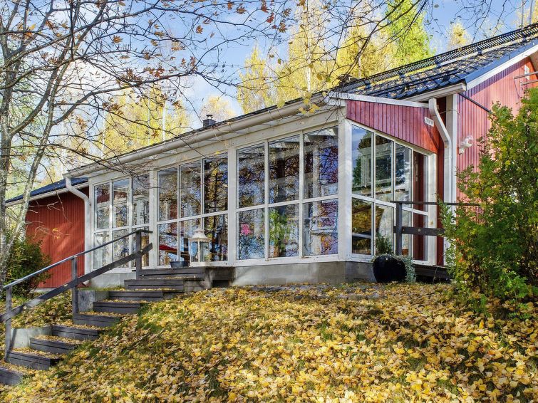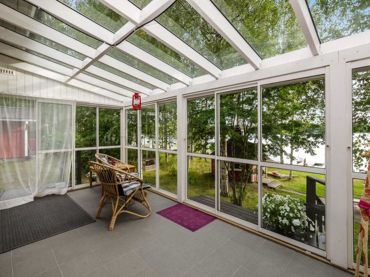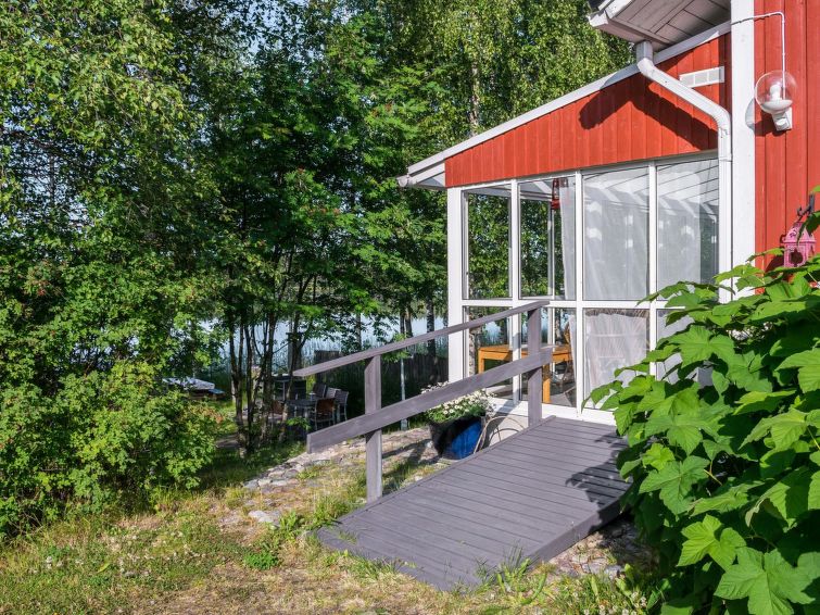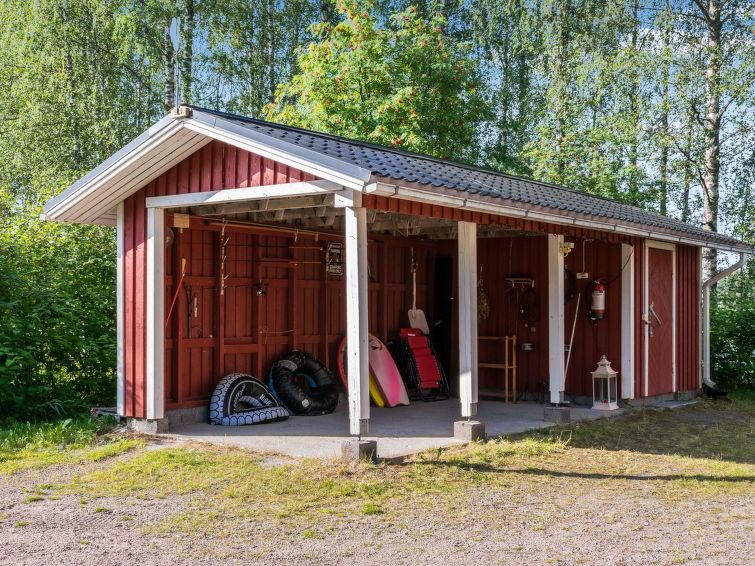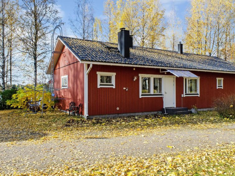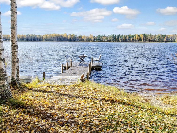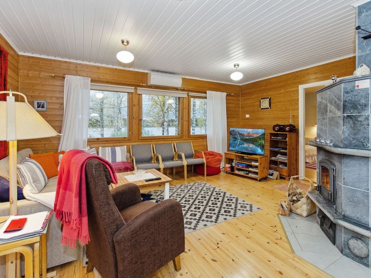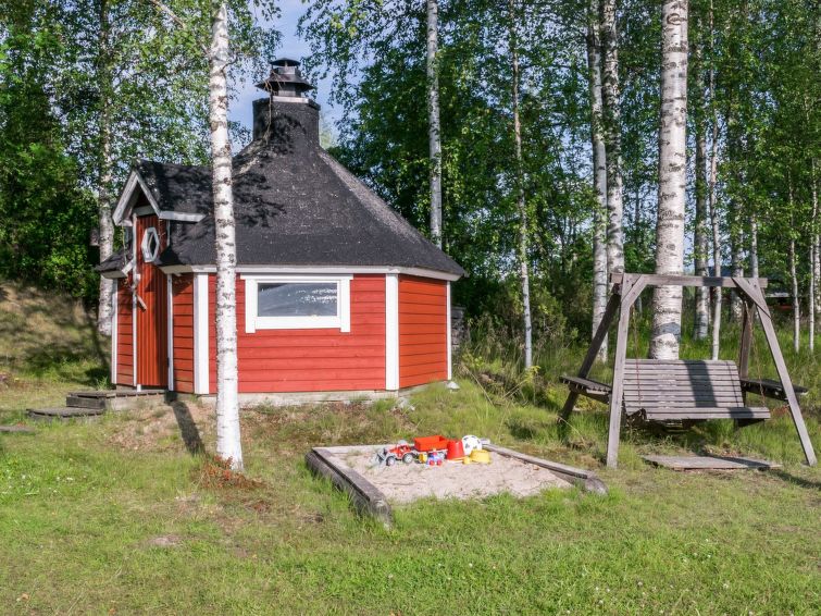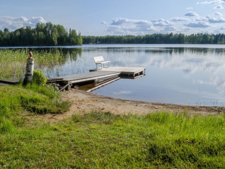 73 km to the north from Joensuu, lake Kuhnusta 24 m (1,93 km²), shallow, child-friendly and gently deepening bottom, beach opens to the southwest, boat, canoe and pier. Wooden holiday cottage 1993, living room-kitchen, bedroom with double bed, bedroom with two beds (90 cm), lounge with a fireplace and spreadable sofa, wood heated sauna, washroom, glazed 20 m² terrace, carport.