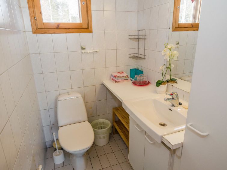 The nearest neighboring house is about 40 meters away. Between the neighboring house and Villa Blanca is neighbour's warehouse building, which prevents direct line of sight. Wooden holiday cottage in a calm location nearby Koli. There is an air source heat pump with cooling and warming functionality in the cabin. Trere are 2 fireplaces in the cabin. The cabin is suitable for people with reduced mobility, there is a wheelchair ramp and a shower chair. Glazed terrace is equipped with infrared heater. There are fishing rods, lures and an ice drill as fishing gear. Trolling permission to lake Kuhnusta is included to rent. Possibility to rent electric outboard from the owner. The sun shines whole day to the plot. On the beach there is a grill hut and outdoor kitchen made from soapstone.