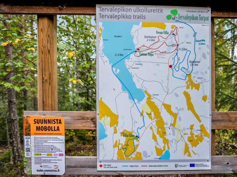 Riding possibility during summer Starhill Stable 29 km, year-round Unettu horse farm Hartola 29 km, riding stable Vahto in Asikkala 30 km, Purnuvuori ski 46 km, Lahti, Messilä 80 km, Himos 102 km, Nokia Eden 183 km, Spa Serena Espoo 199 km.