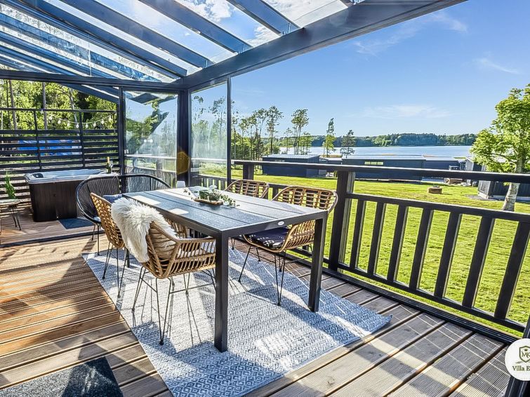 Villa Eden has an integrated space consisting of kitchen and living room. The space is equipped with air source heat pump. There are also bedroom, two lofts with windows, washroom with sauna, and large glazed seaside terrace with outdoor hydro-massage, barbecue and dining group.