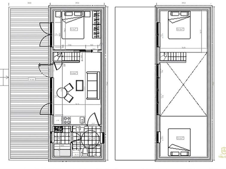 The bedroom has 160 cm wide double bed, TV and wardrobe (one part is locked and reserved for the goods of the villa owner). There are two 80 cm wide beds in both lofts.