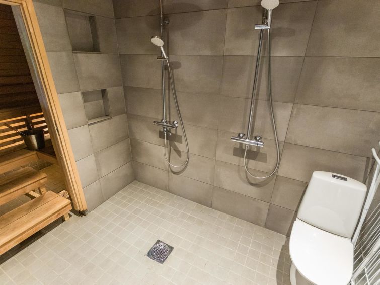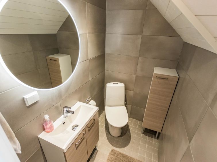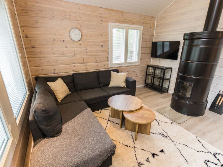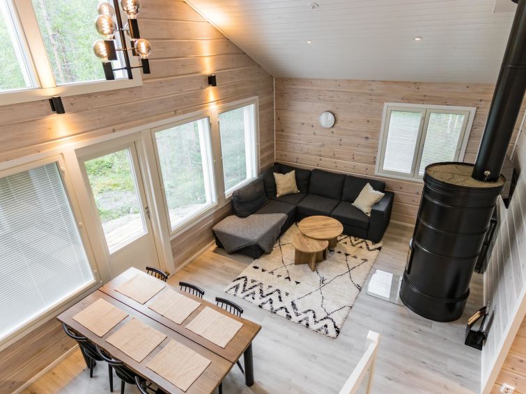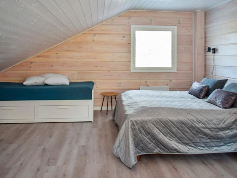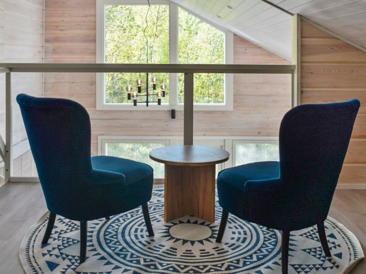 The bright living room of the apartment can accommodate even a larger group, and the open kitchen offers facilities to prepare meals easily. On the ground floor, there is also a washroom and sauna, separate WC and two bedrooms, both with two separate beds.