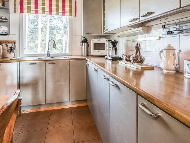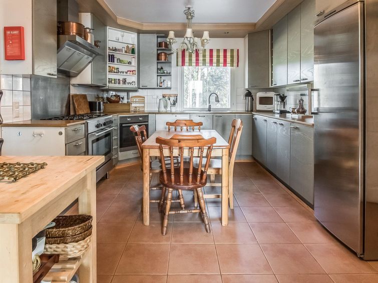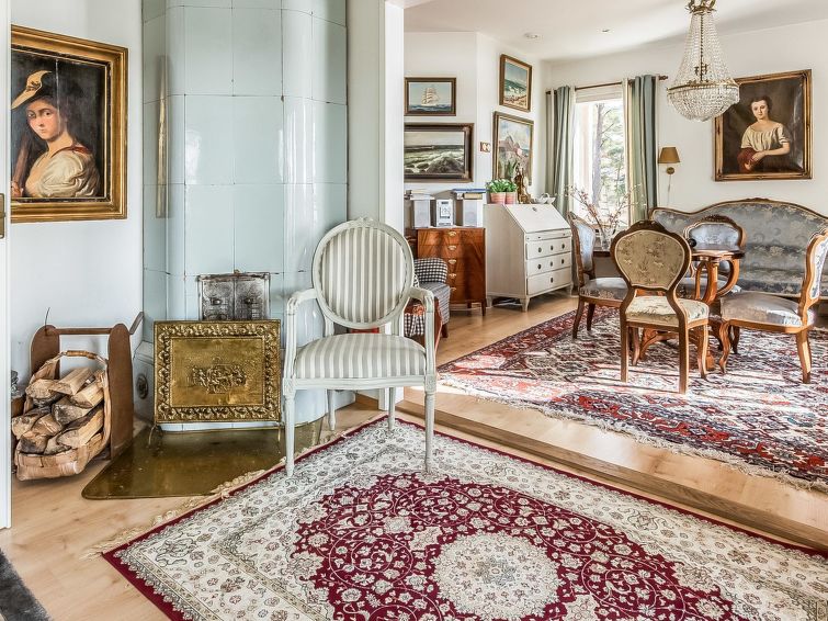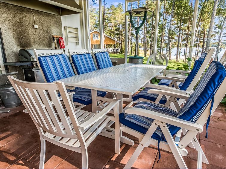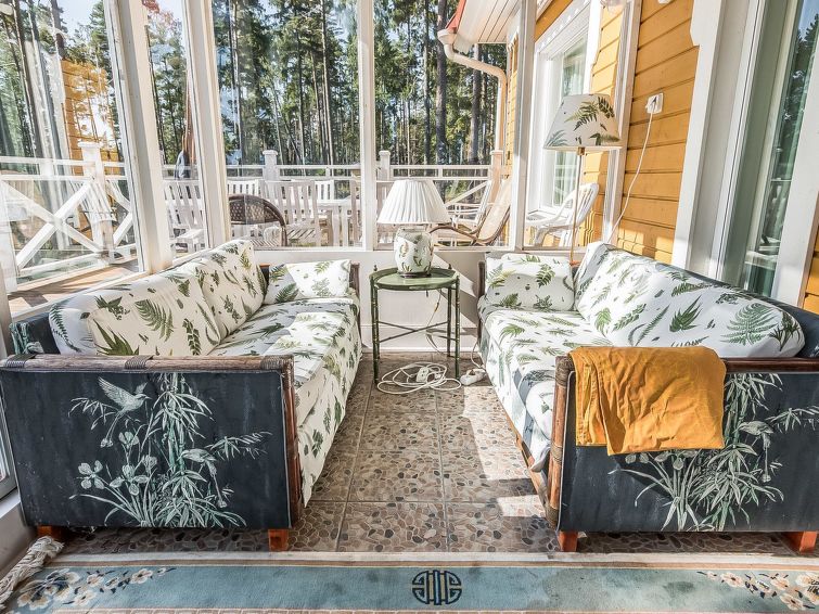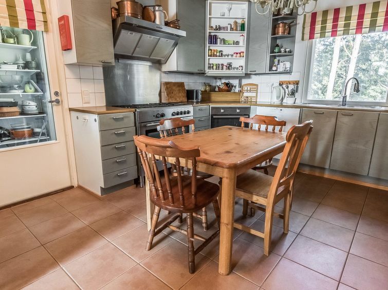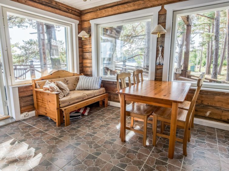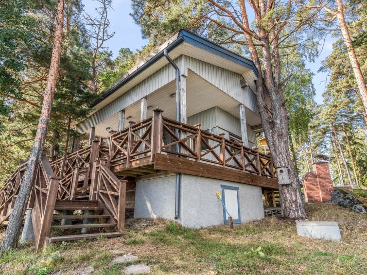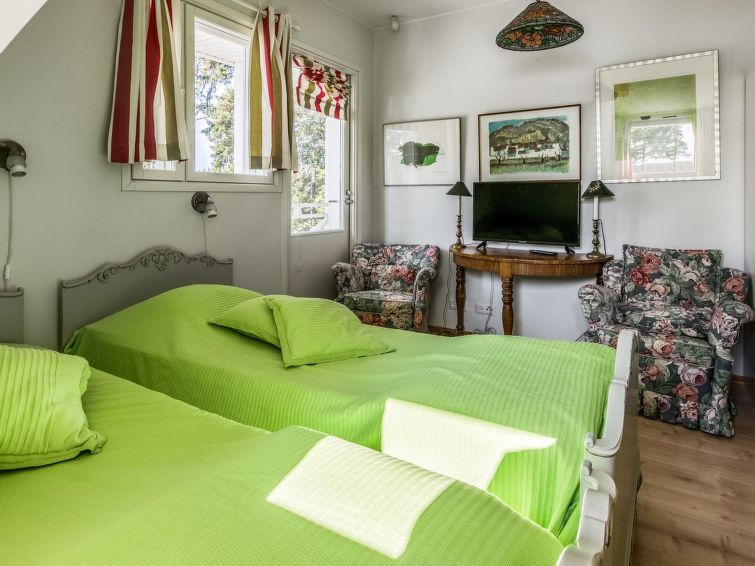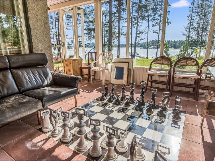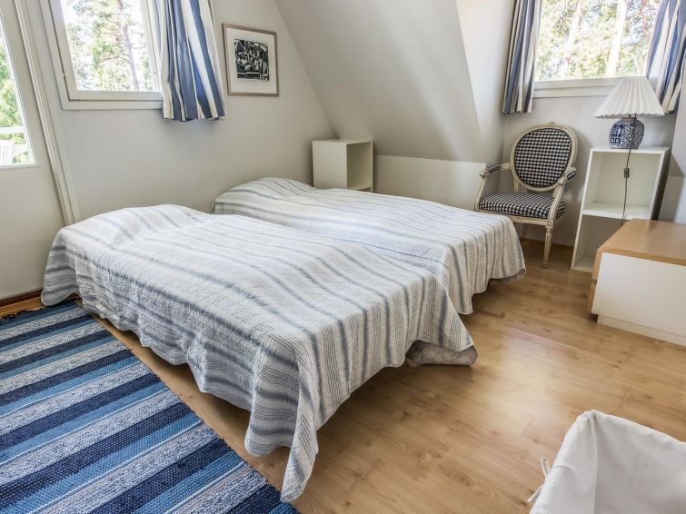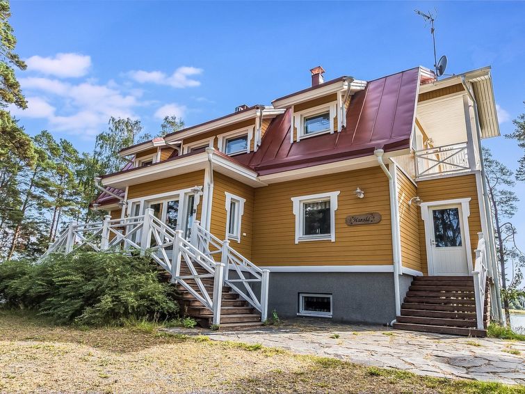 200 km west of Helsinki, Turunmaa Archipelago Sea/Hiittinen area 15 m, shallow, hard sand bottom in natural state, own boat, shore and big jetty for a boat. Mooring buoy for sailing boat. Chalet of company representation standard, built 2009. 3-storey building called Villa Harald. Middle floor: kitchen, dining room, library and one bed room with single beds. Upstairs: 4 bedrooms with 2 single beds in each (all with own WC, shower and balcony). In upstairs TV lounge and there is possibility to make two extra beds to the sofa-bed. Downstairs: sauna section, conference room, room with fireplace, bar (bring your own drinks), glazed terrace, outside terrace. The villa has also a hot tub and 8 televisions. Seashore sauna 25 m², room with fireplace, sauna, 2 shower, outside fireplace. ATTN. Swimming pool at the sauna section is not available at the moment. Splendid chalet in Hiittinen archipelago. On sunny plot with fine sand shore. Nearest neighbour is chalet nr. 8650, distance 30 meters. Sight to neighbouring chalet. Tenniscourt in shared use with Villa Harald and neighbour villa Helga (playing turns must be booked on the spot, please take your own tennis racket etc with you). Water (iron-rich in this area) can be used for cooking but client has to bring the drinking water with him. Village of Hiittinen is 2 km from the chalet. Good fishing waters nearby. Boat trips and fishing guide services available by arrangement. The Hiittinen archipelago is famous for its natural beauty and excellent fish stocks. There are 2 grocery/convenience stores, 2 summer restaurants, a café and service station on the island. On way to location there is a short sea trip in a vessel (the Aura) connecting Kasnäs with Hiittinen. Note! During Sundays the last vessel to Kasnäs leaves at 18.45. Helsinki 200 km, Salo 80 km, Meri-Teijo golf and ski centre 60 km, Rosala 12 km (Viking centre), Kasnäs (Archipelago Visitor Centre Blue Mussel), Kasnäs also has connection to Bengtskär lighthouse island. Visits to Bengtskär lighthouse by boat can be arranged with local entrepreneur, journey takes approx. 1 h. Note! Bed linen is included in price.