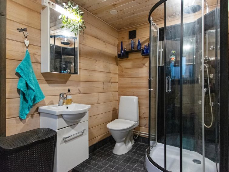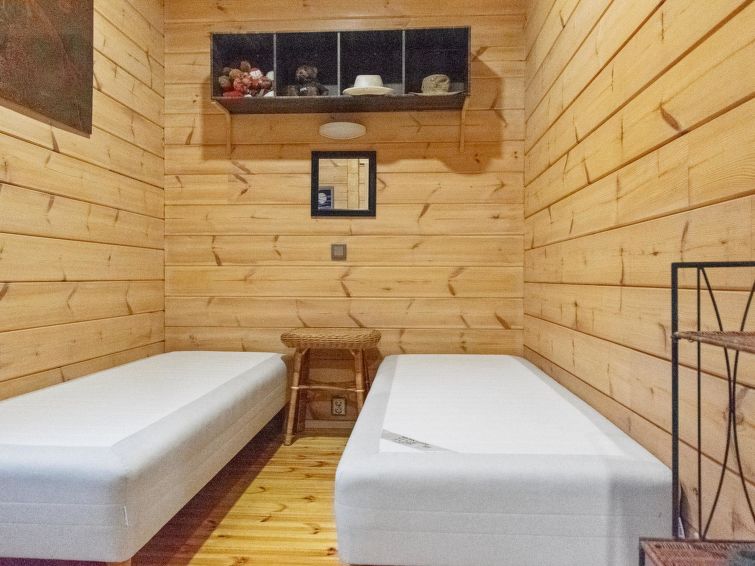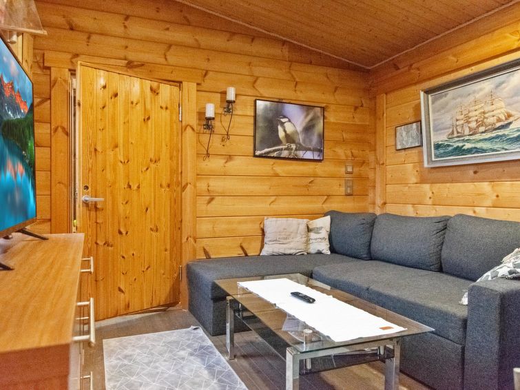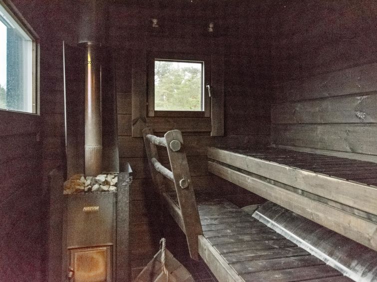 Wooden cabin, 90 km to the southeast of Turku, the archipelago sea 170 m, no private beach. The cabin includes a kitchen, a sleeping alcove with a 120x200 cm bed, a bedroom with two beds, and an additional bed for two from the sofa bed in the living room. The sauna is wood-heated, and there's a shower room with a WC. A separate storage room with a washing machine is accessible through the front terrace.