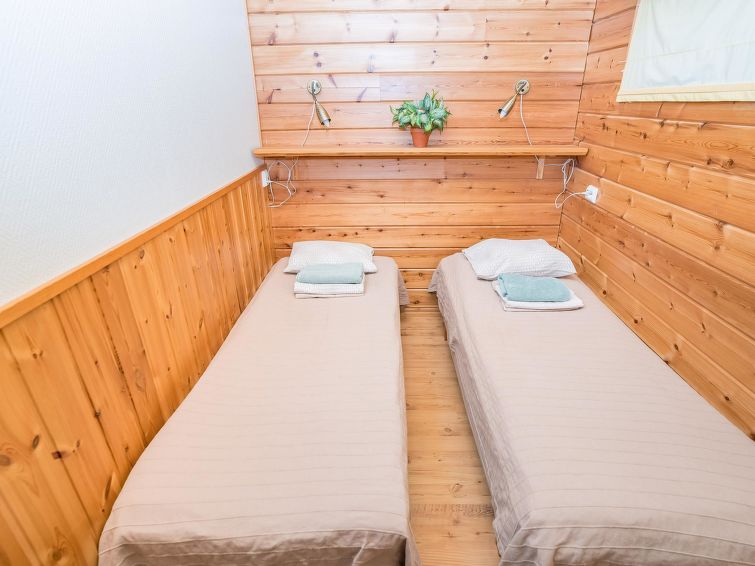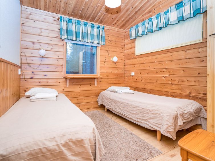 Log cottage, built in 2002, bedroom 1: 2 beds, bedroom 2: 2 beds, bedroom 3: 2 beds. Combined kitchen/ living room, electric sauna. Log cottage, situated by the pond Petäjälampi. Totally 6 cabins on the same yard. Cabins are located on the edge of the camping site (camping site open yearly during 1.6. - 30.9.). Spa Kuusamo Tropiikki / Kuusamo Golf 1.5 km by road (by walk 0.5 km). Excellent opportunities for hiking. Good fishing opportunities. Suitable for families, golf players and active people.