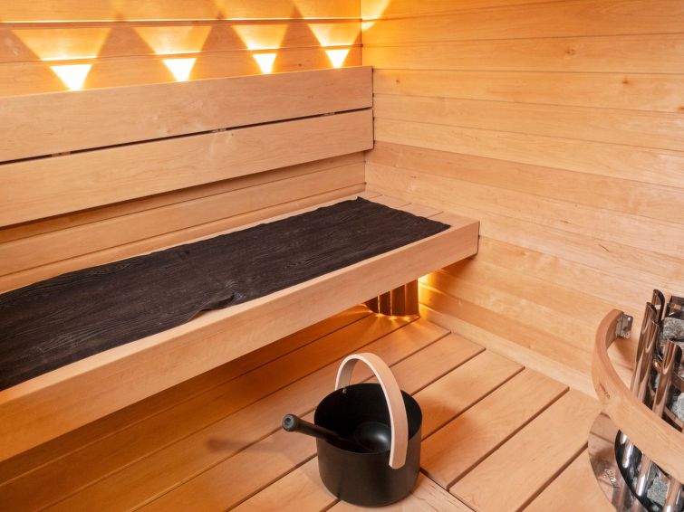 Wooden villa. Sofa bed in the living room/kitchen, 2 motorized beds in the bedroom, beds width 90 cm, in the another bedroom 2 beds (width 90 cm), sauna, washroom and separate WC.