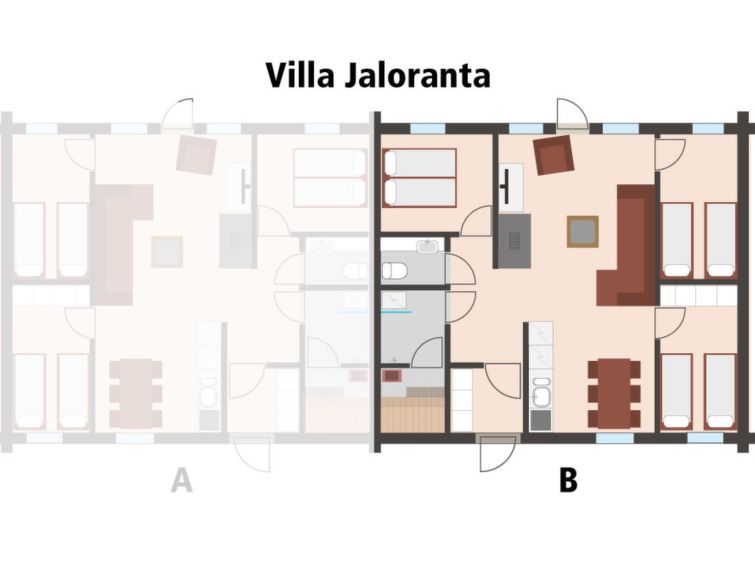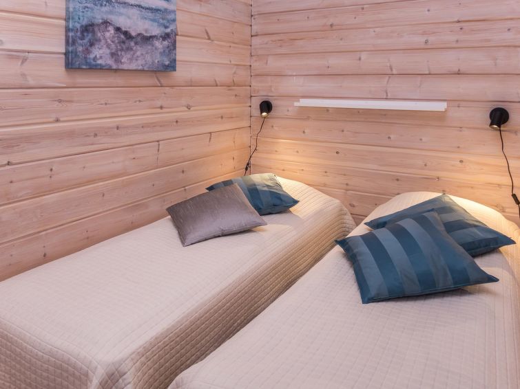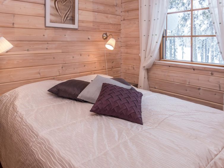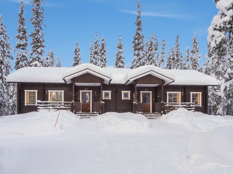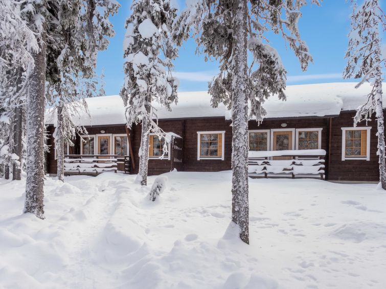 30 km north from Kuusamo, Vuosseli (East Ruka) 4 km, Ruka village (West Ruka, Ruka square) 8 km, Lake Vuosselijärvi 40 m. Semi-detached log cottage built in 2007, bedrooms 1-3: 2 beds in each, combined kitchen/living room, electric sauna.
