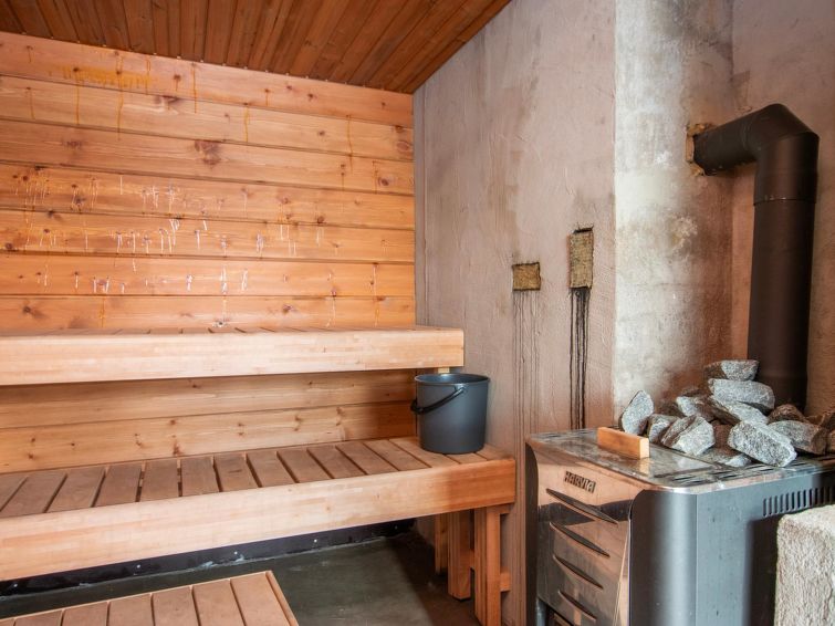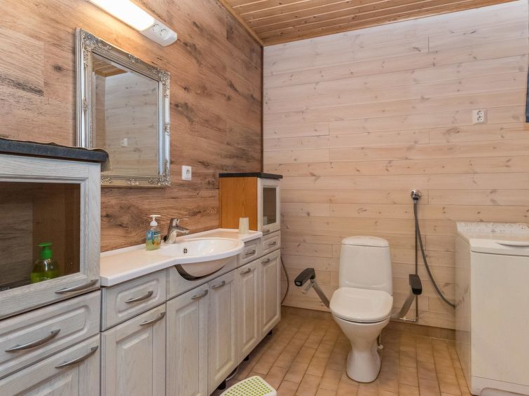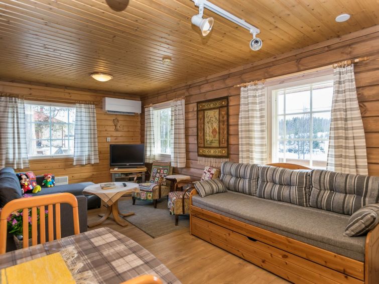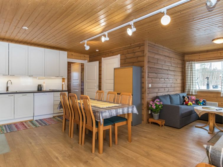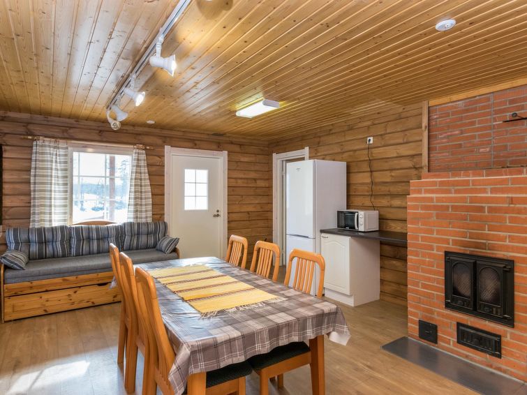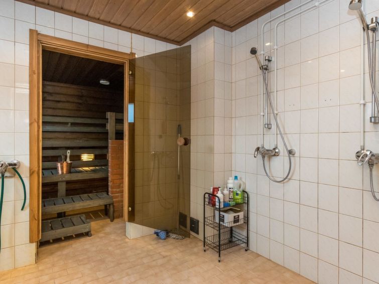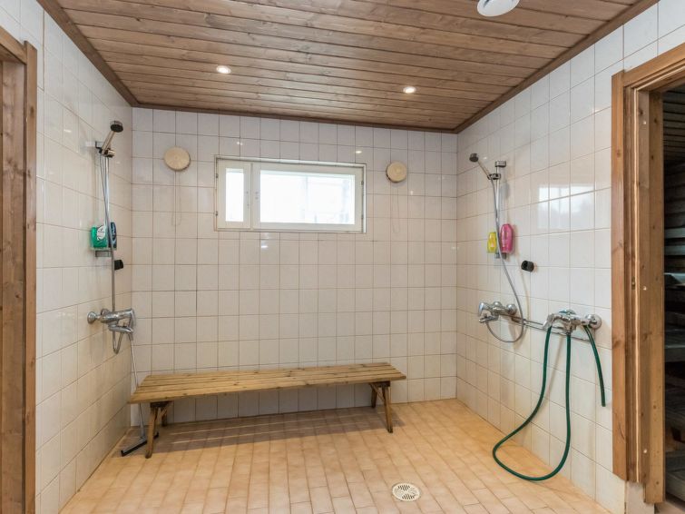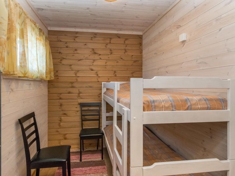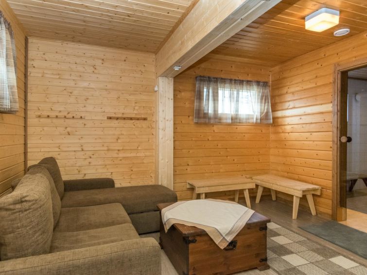 Wooden cottage, built in 1999, kitchen, living room with foldable sofa bed, bedroom with 2 beds, second bedroom with bunk bed, dressing room with foldable sofa bed, 4 showers in the washroom, sauna (wood stove), separate toilet. Covered porch.
