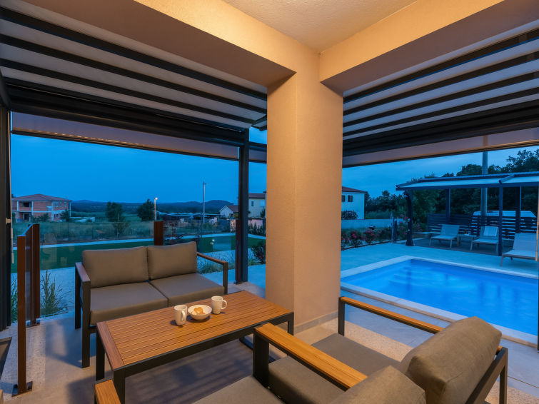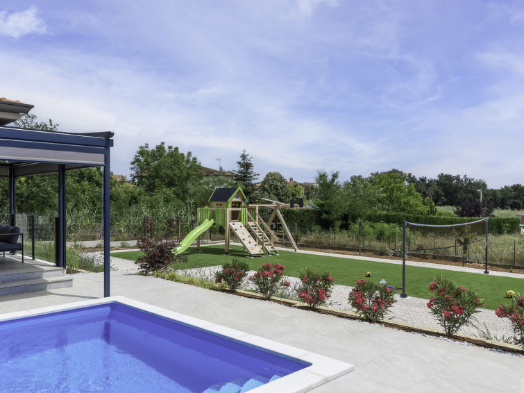5 rom hus 190 m2 på 2 etasjer. Meget vakkert og smakfullt møbler: stue/spisestue med, satelit-TV (flatskjerms TV), air-conditioning. Utgang til terrassen. 1 rom med, 1 dobbeltseng (180 cm, lengde 200 cm), dusj/bidèt/WC og satelit-TV (flatskjerms TV), air-conditioning. Åpent kjøkken (stekeovn, oppvaskmaskin, 4 induksjonskomfyr, brødrister, vannkoker, mikrobølgeovn, frys, elektrisk kaffemaskin). Sep. WC. øverste etasje: 1 rom med, 1 dobbeltseng (180 cm, lengde 200 cm), dusj/bidèt/WC og satelit-TV (flatskjerms TV), air-conditioning. 2 rom, hvert rom med, 1 dobbeltseng (180 cm, lengde 200 cm), dusj/bidèt/WC og satelit-TV (flatskjerms TV), air-conditioning. Utgang til terrassen. Varmekabler i gulvet (ekstra). Terrasse 27 m2, dekt, terrasse 13 m2. Terrassemøbler, liggestoler. Utsikt av svømmebassenget. Fasiliteter: safe, strykejern, myggnett, høy barnestol barneseng, hårføner. Internett (trådløs LAN [WLAN], gratis).