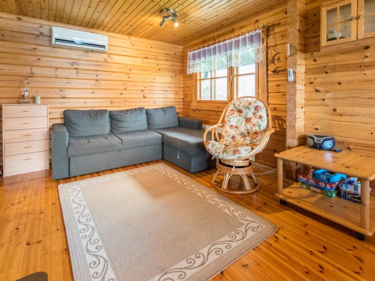 Log cabin (brand Honkarakenne) with living room (including spreadable sofa bed), living room/kitchen and heat reserving fireplace.