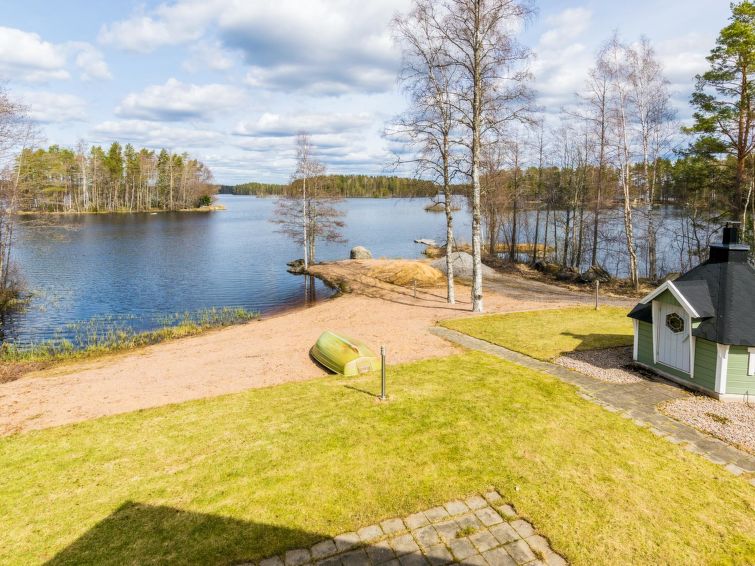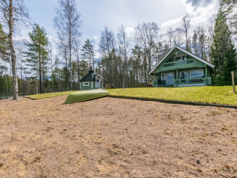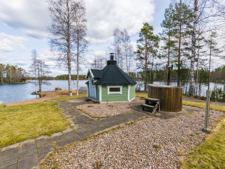 Terrace with furniture and gas grill in front of the cabin. Cabin with own sand beach by the lake Venesjärvi near the city of Kankaanpää. Cooking hut and hot tub in the yard. Usage of the hot tub is included in the price. The hot tub can be filled with water pumped from the lake.