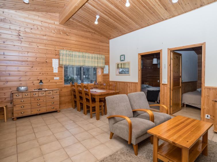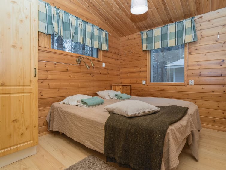 5.0 km north of Kuusamo, Ruka 20 km, pond Petäjälampi, hard, sandy beach, there are five piers/swimming places in the area, most suitable for children is the one front of lakeside sauna (gently sloping till 5-6 meters). Log cottage, built in 2005, bedroom 1: 2 beds, bedroom 2: 2 beds, combined kitchen/living room, electric sauna. Log cottage, situated by the pond Petäjälampi. Totally 6 cabins on the same yard. Cabins are located on the edge of the camping site (camping site open yearly during 1.6. - 30.9.).