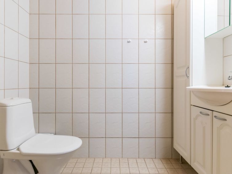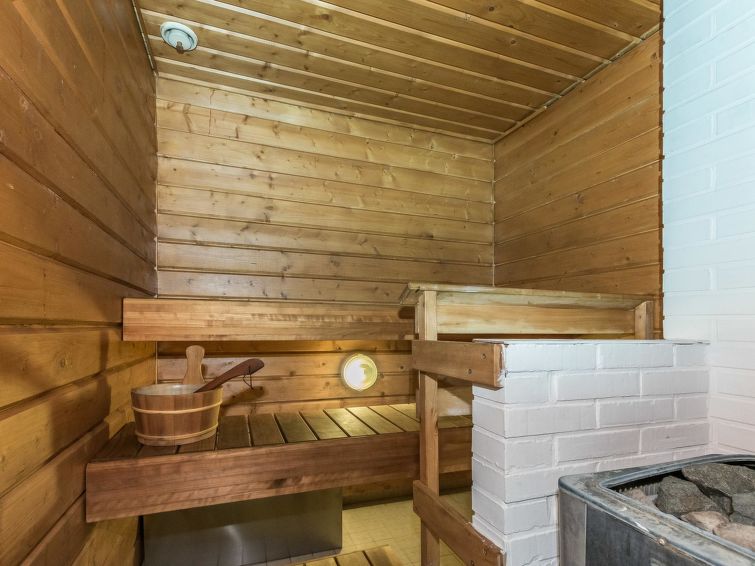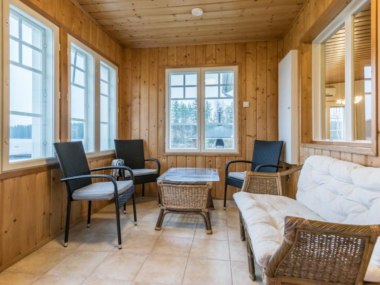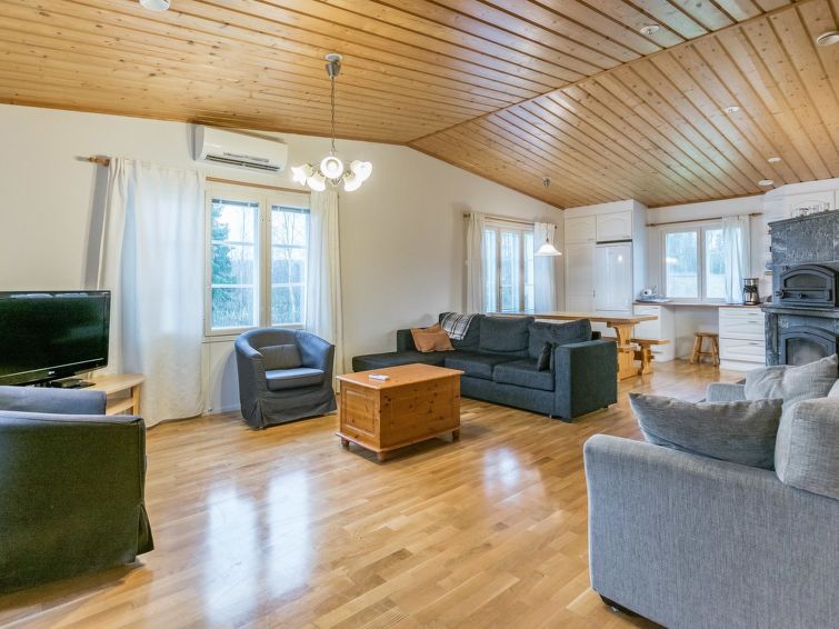Well-equipped and spacious wooden cabin with boarded outer walls (2004), spacious living room (sofa bed 140x200 cm, bed for two) and living room/kitchen with well-equipped kitchen facilities. Two bedrooms, bedroom 1: three beds, bedroom 2: three beds, separate WC, washroom with two showers, sauna (wood-burning sauna stove).