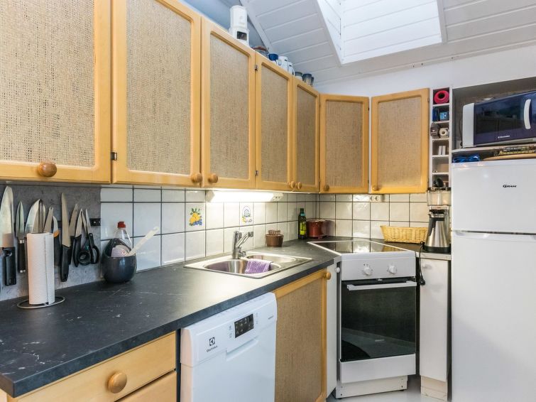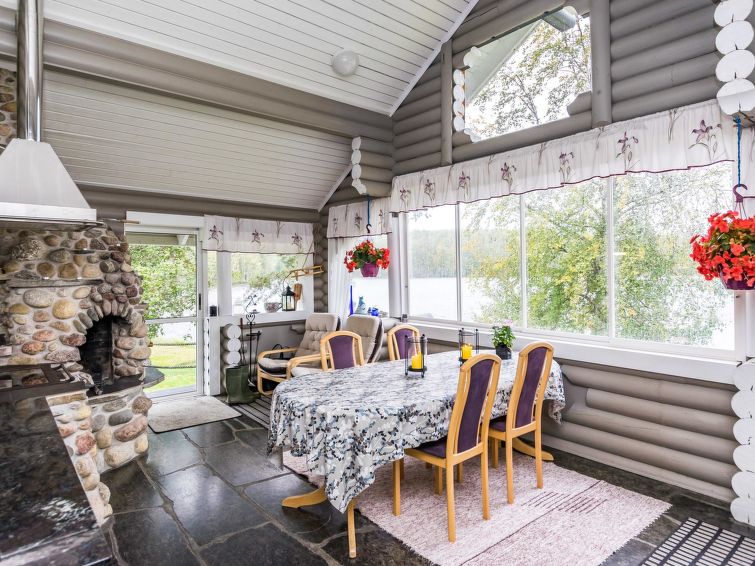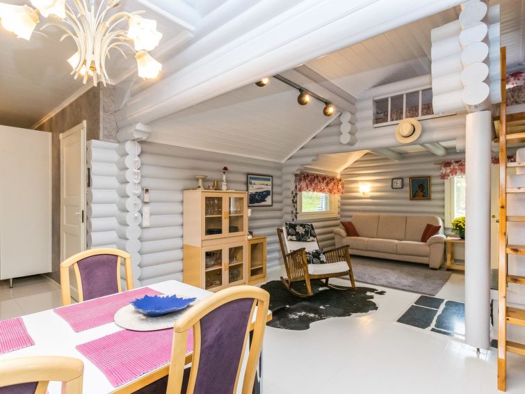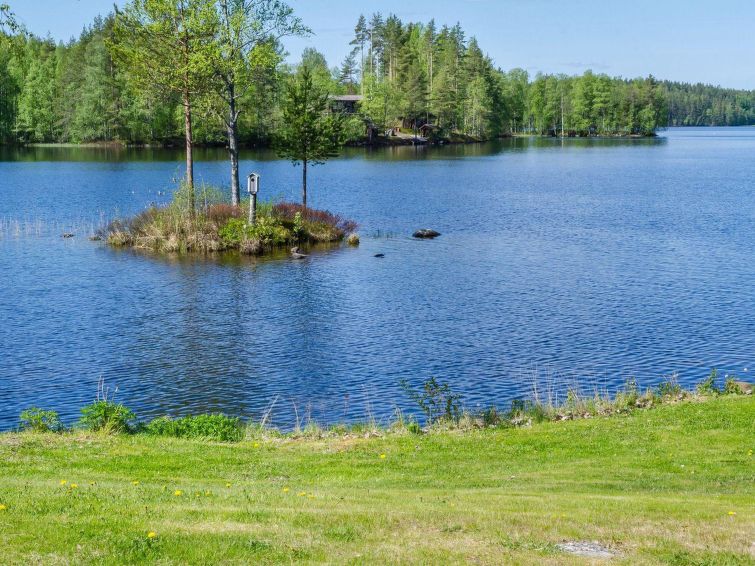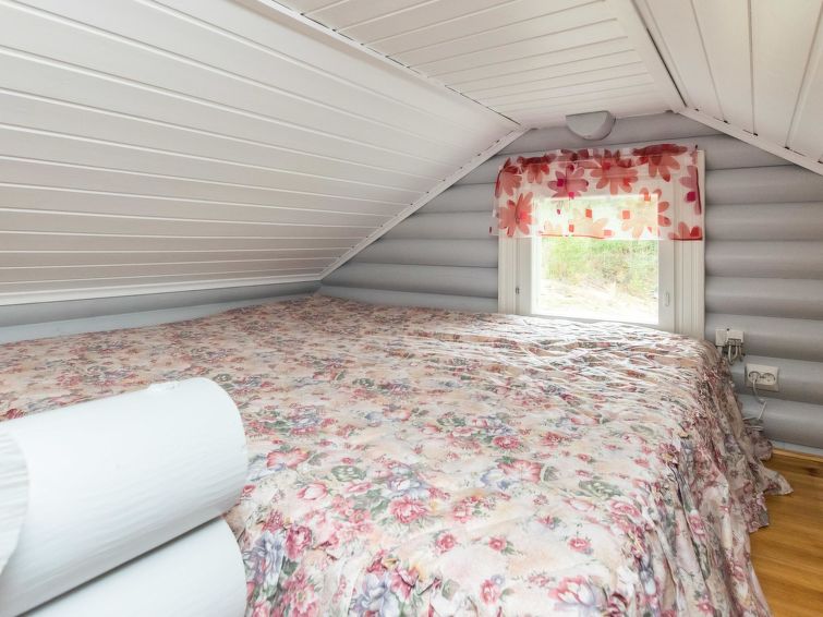 74 km to the south from Joensuu, lake Pyhäjärvi (Karelia) 15 m (206,79 km²), own beach. Holiday cabin 1984, extended in 2005 and renovated in 2008 and 2021. Living room-kitchen, bedroom with double bed, bed room with sofa bed (width 140 cm), in the loft, a double bed made of two 90 cm wide frame mattresses with a single mattress pad, mattress thickness 25 cm.