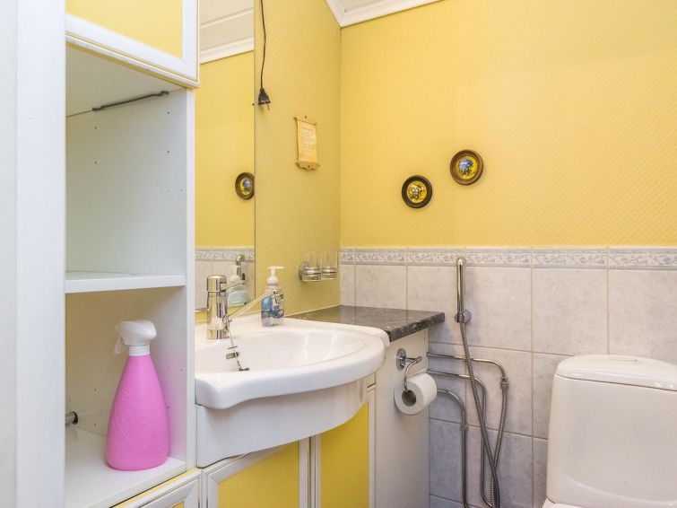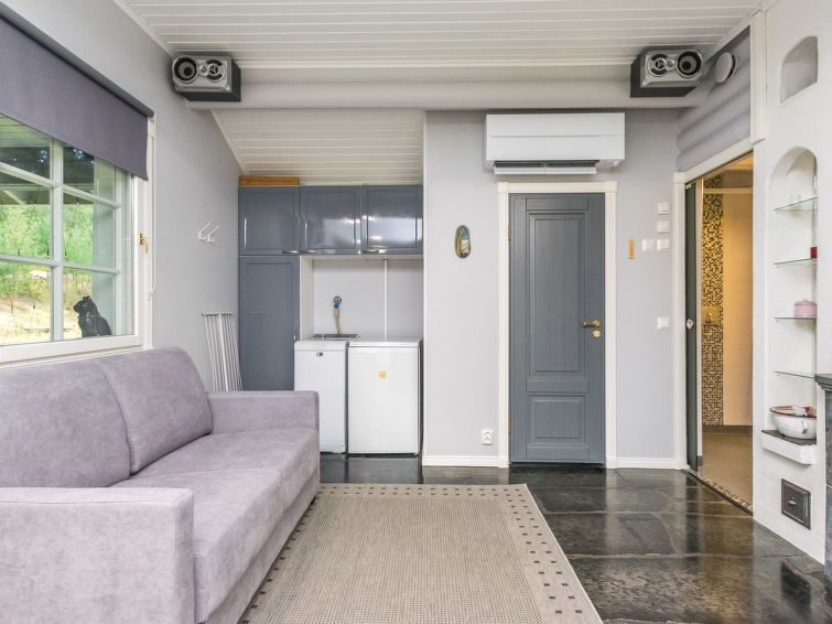Separate sauna building 37 m², fireplace room with spreadable sofa bed, air source heat pump, fridge, washing machine, wood-burning sauna stove (heating from the fireplace room), washroom with 2 rain showers, toilet and glazed terrace 15 m². Sauna building completely renovated in 2018.