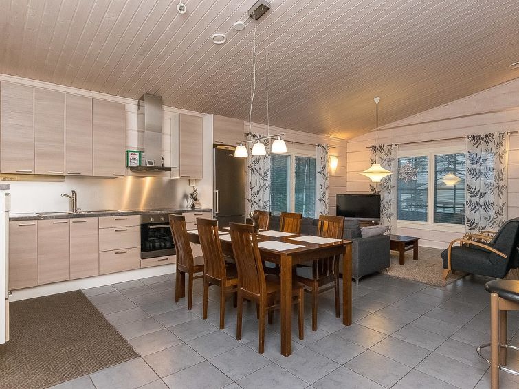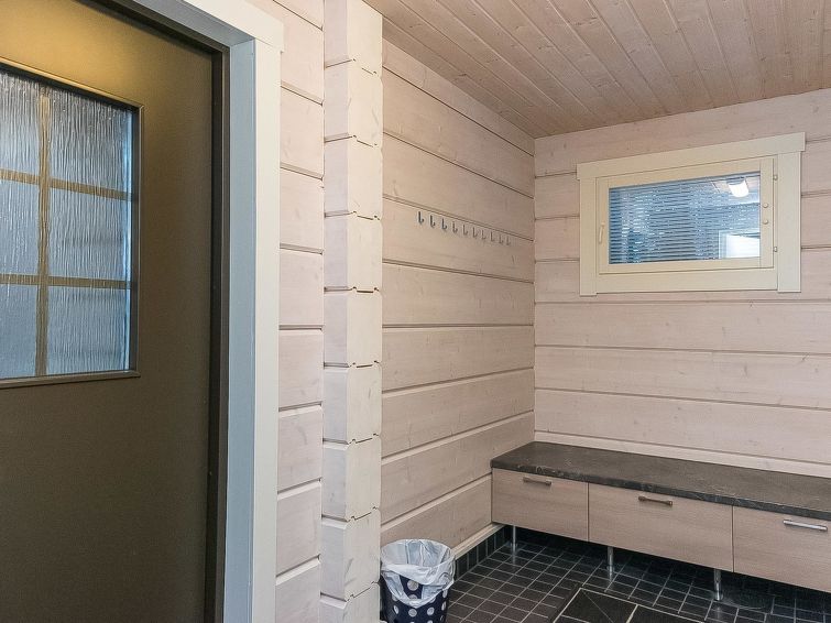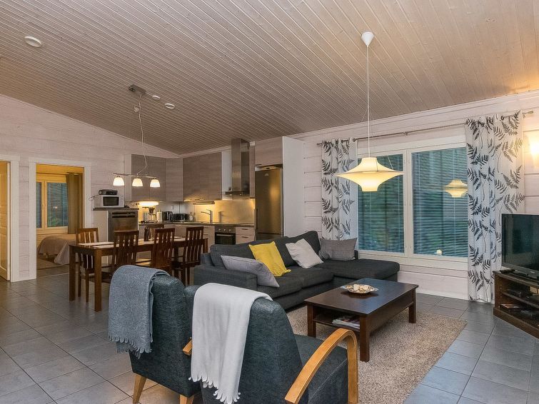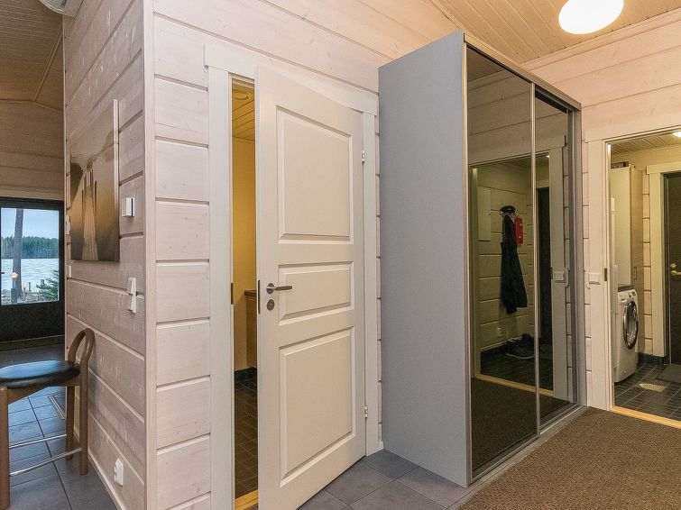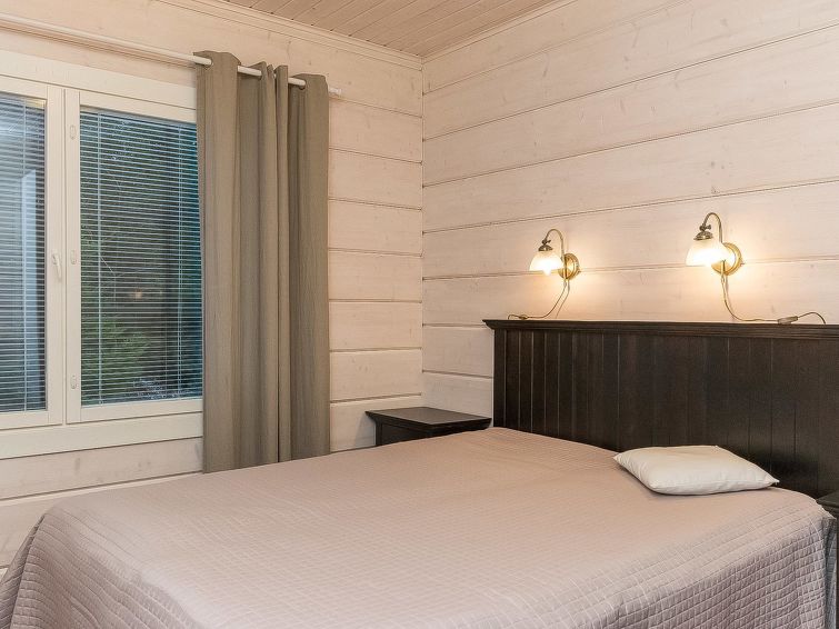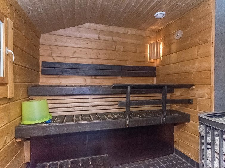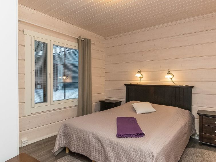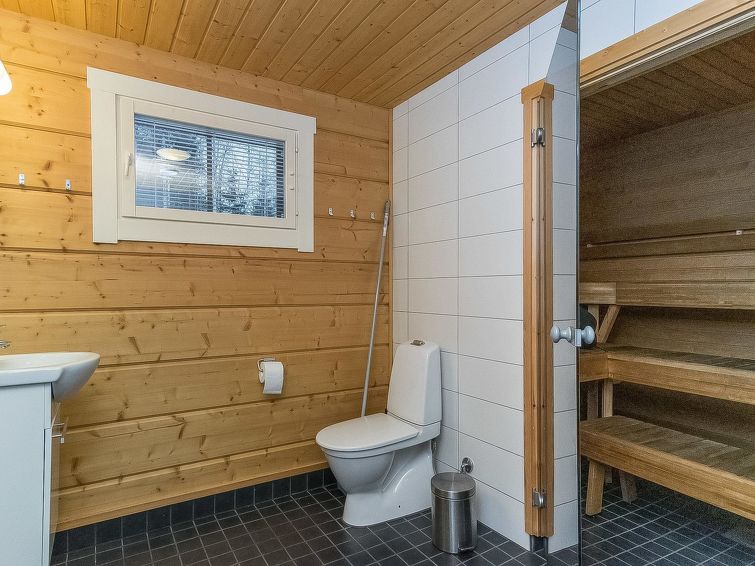 Log villa 2014, living room/kitchen, three bedrooms (10 m²), one with double bed and other two with two beds, all with spacious wardrobes, dressing room, washroom (2 showers and WC) sauna with electric sauna stove, separate WC, terrace.