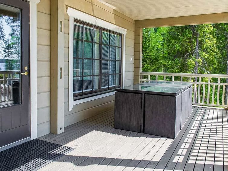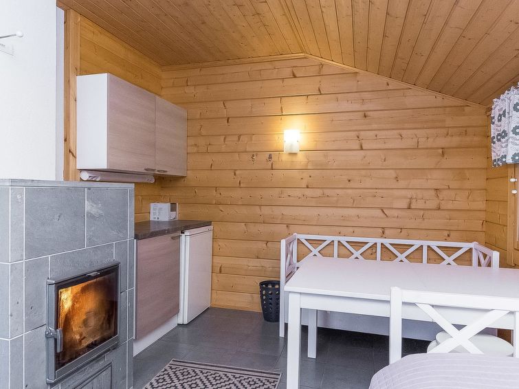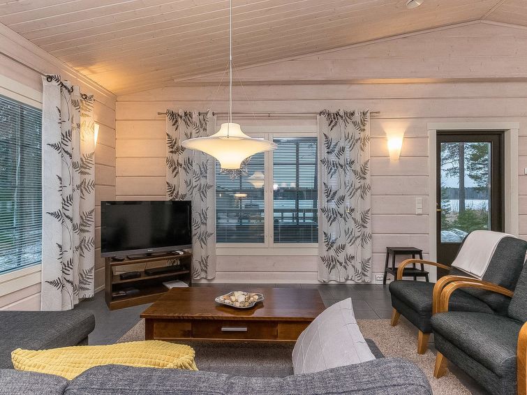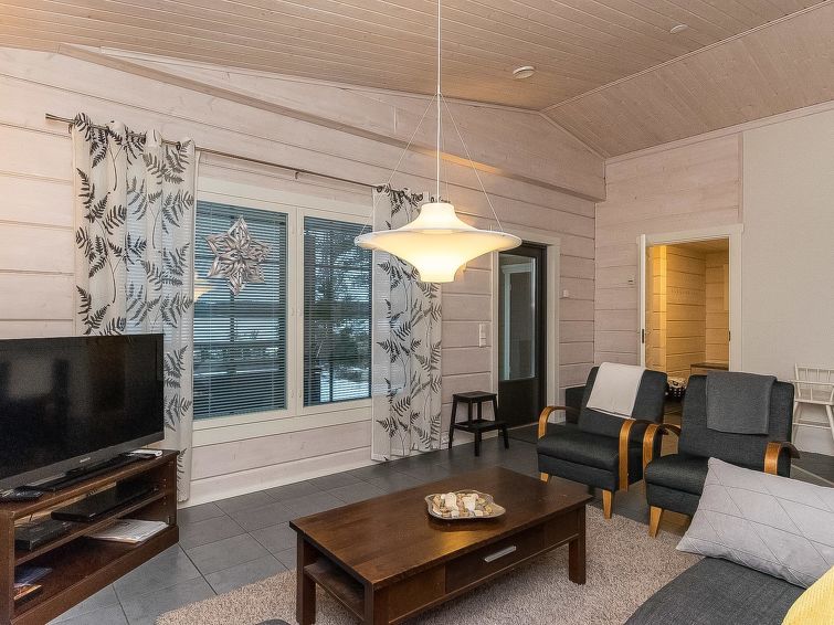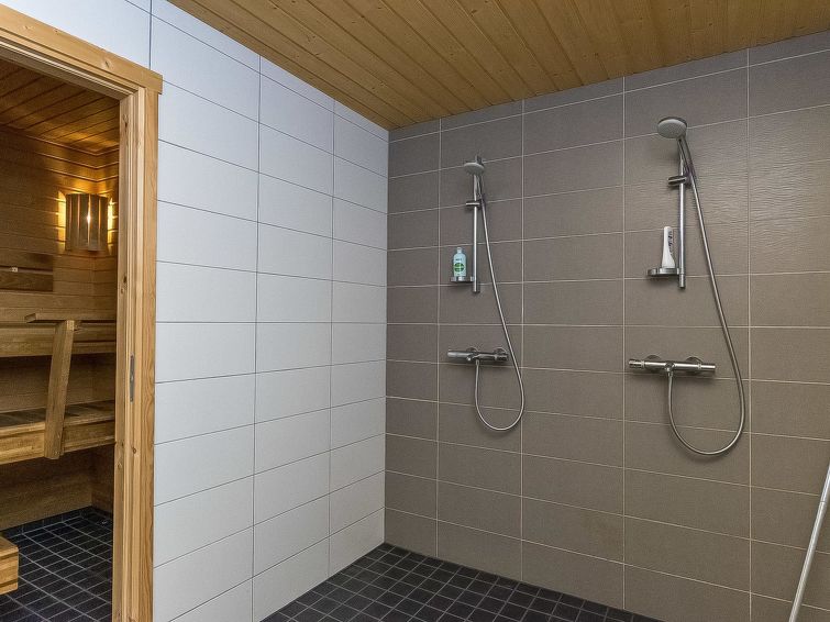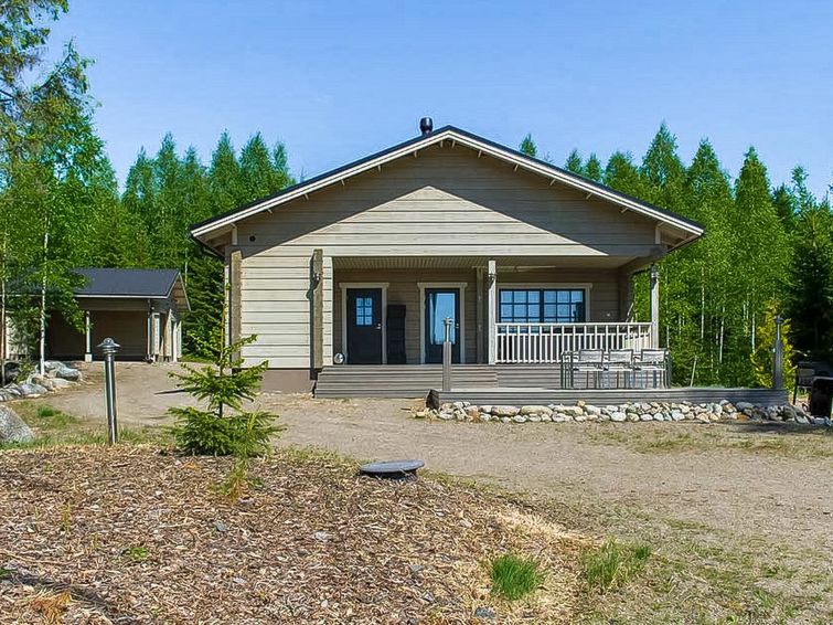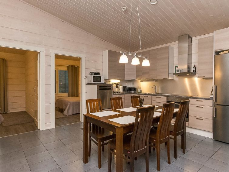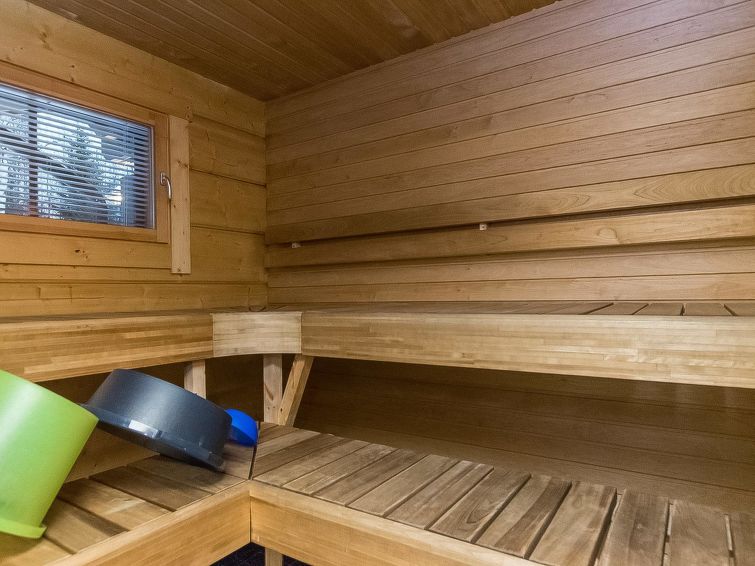 Log villa 2014, living room/kitchen, three bedrooms (10 m²), one with double bed and other two with two beds, all with spacious wardrobes, dressing room, washroom (2 showers and WC) sauna with electric sauna stove, separate WC, terrace.
